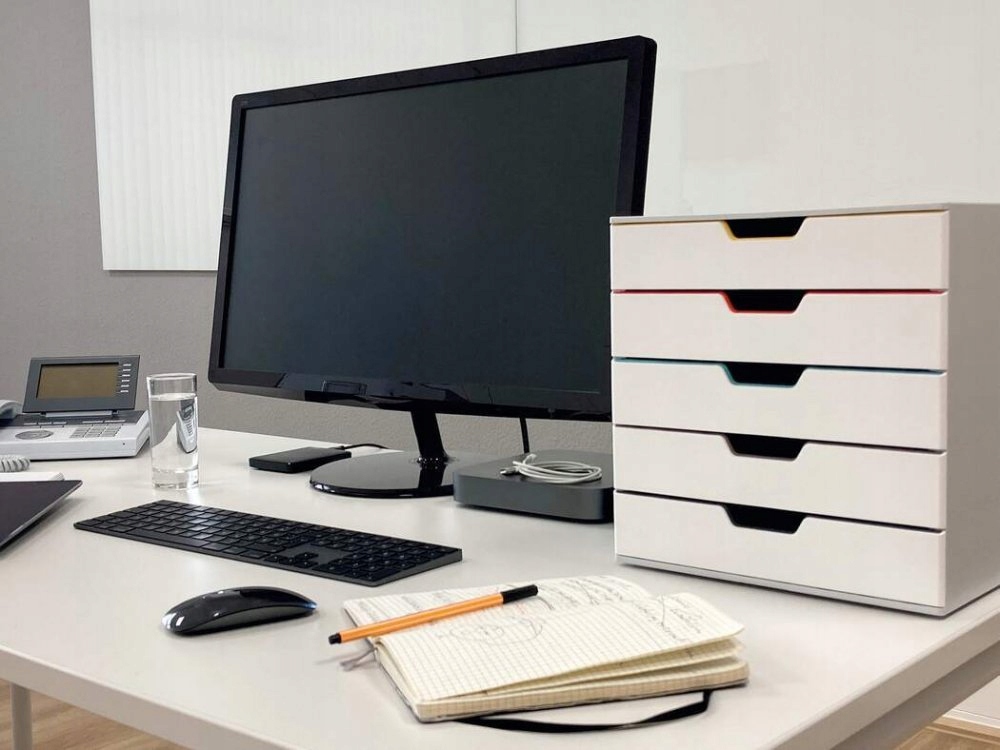 - Контейнер с 5 яркими ящиками из качественного пластика, помогающий систематизировать документы.