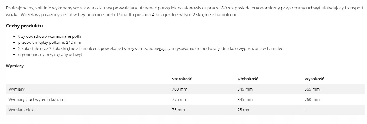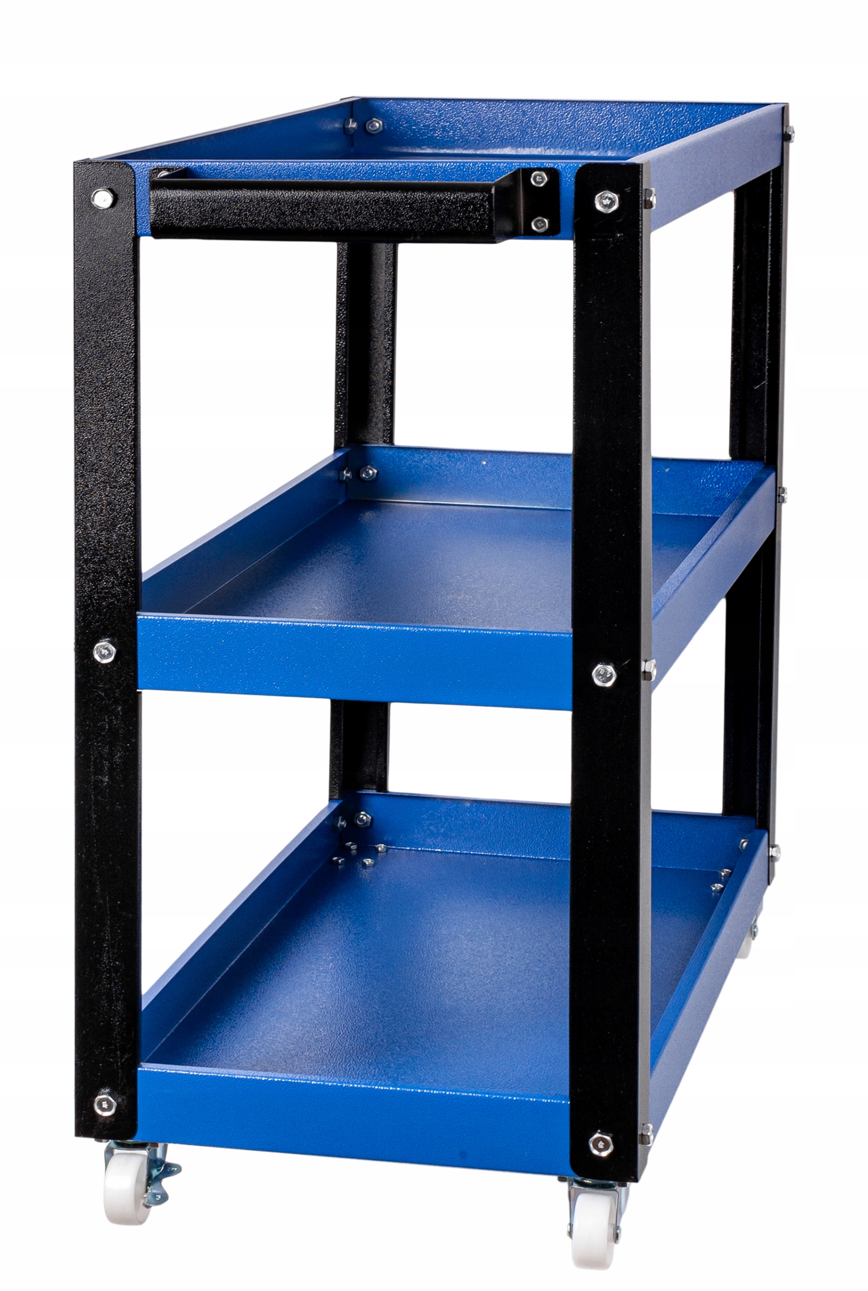 Шкаф для инструментов/тележка мастерская – незаменимый инструмент в вашем гараже. Добротно сделанная тележка с тремя металлическими полками позволит поддерживать порядок в мастерской и перевозить необходимые для работы инструменты. Благодаря установленным колесам мы можем свободно разместить тележку в нужном месте, колеса имеют возможность блокировки, позволяющую фиксировать шкаф на неровных поверхностях. Два из четырех колес поворотные, что обеспечивает свободное управление.