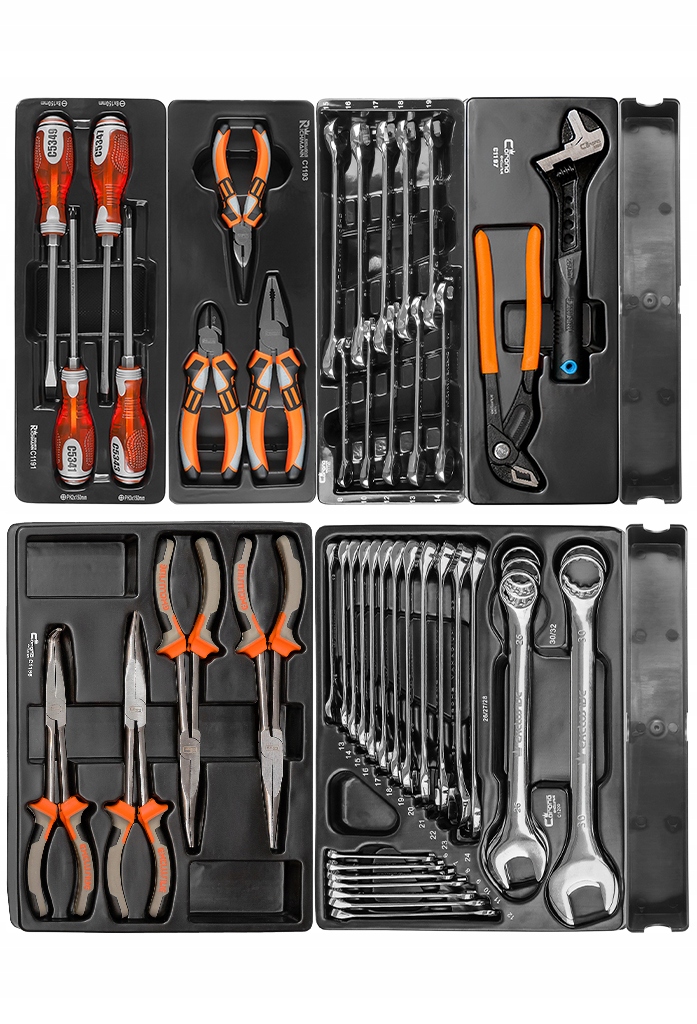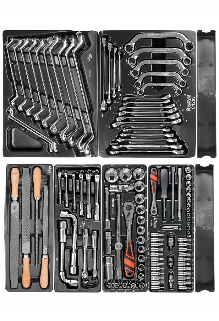 Первые 5 ящиков шкафа и выдвижной ящик были оборудованы вставками для инструментов, а 2 ящика остались пустыми для собственного оборудования.