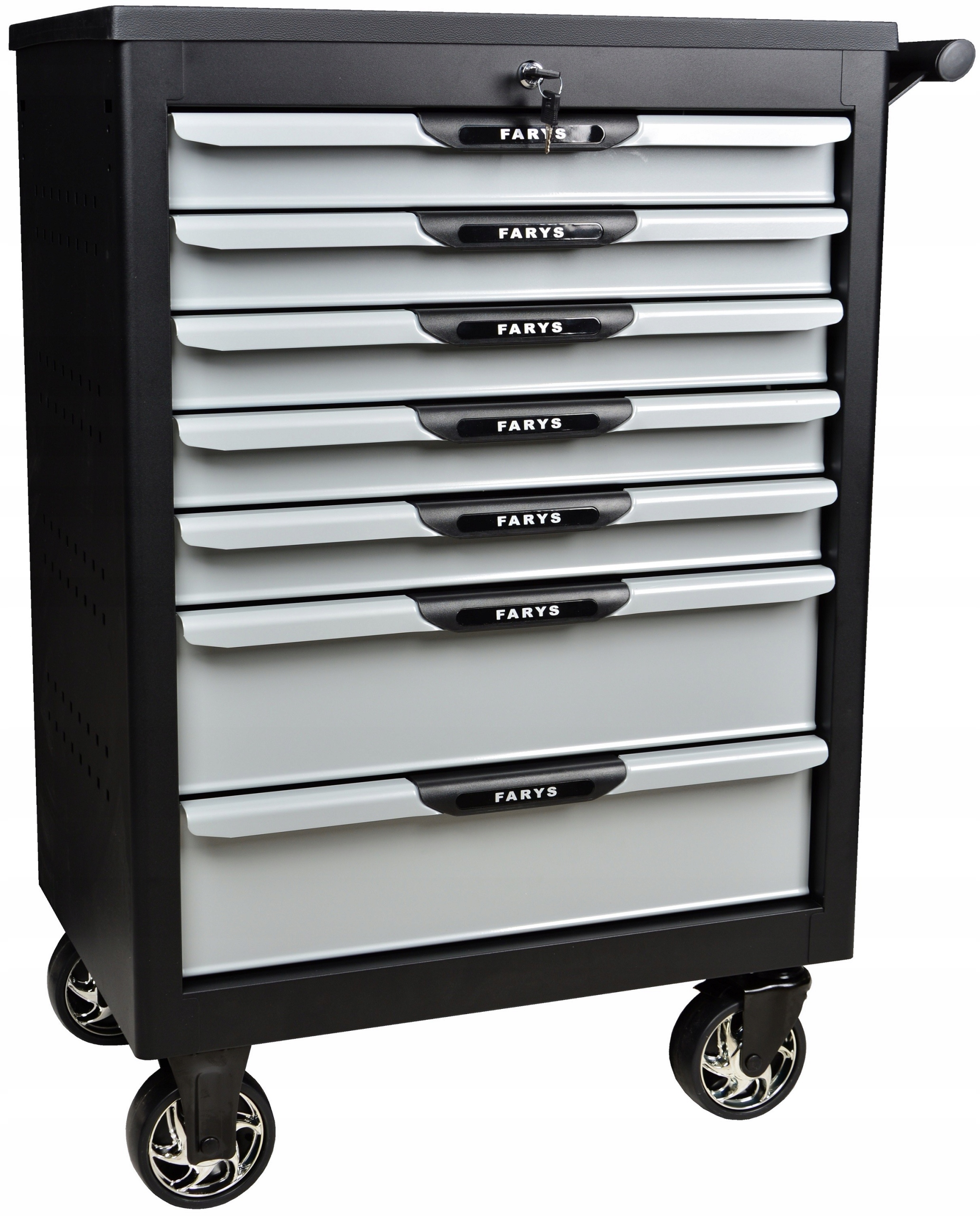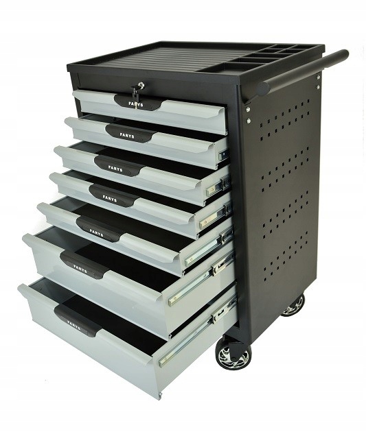 Шкаф изготовлен из прочных и прочных материалов, которые гарантируют приятное и долгое использование шкафа даже в условиях мастерской. Имеет 4 колеса, центральный замок и выдвижные ящики с поролоном. Дополнительно шкаф оснащен двумя тормозами, размещенными на колесах шкафа, которые обеспечивают устойчивость шкафа во время работы и позволяют работать даже при наклоне рабочей поверхности.