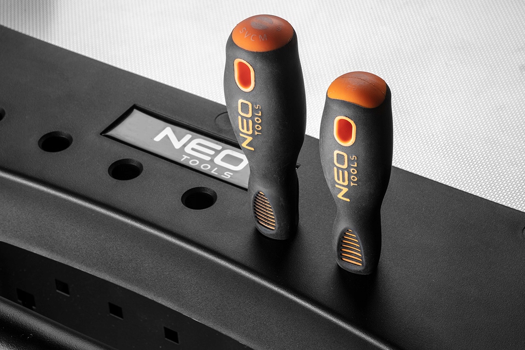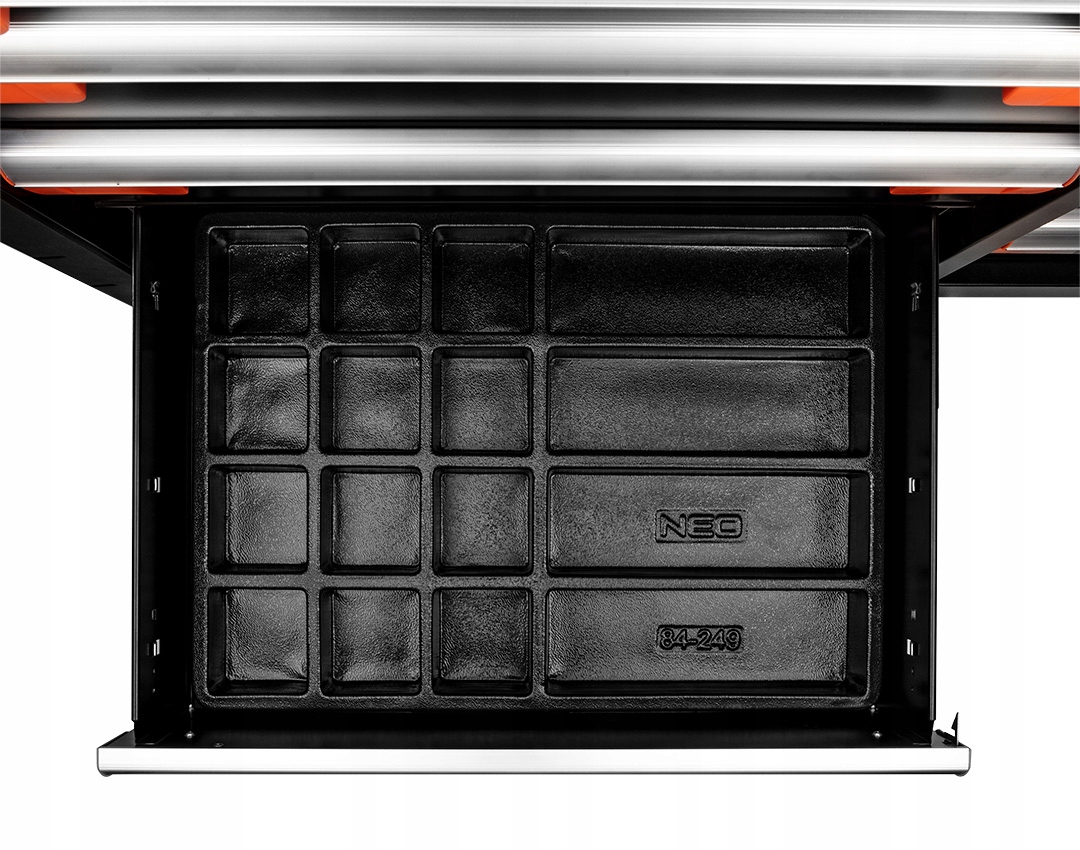 Шкаф для инструментов, 12 ящиков, 1105х465х825 мм (с колесами 978 мм), 6 больших, в том числе 3 низких, размерами 560 х 400 х 60 мм и 3 высоких, размеры 560 х 400 х 139 мм мм, 6 маленьких, в том числе 3 низких, размеры 252,5 х 400 х 60 мм и 3 высоких, размеры 252,5 х 400 х 139 мм, корпус стальной, грузоподъемность 600 кг, алюминиевая верхняя часть с местами для отверток и аксессуаров, боковая перфорация для крючков и аксессуаров NEO, угловые бамперы, боковая ручка, замок для ящика, ящики открываются на 100%, совместимы со вставками для инструментов Neo, шарик направляющие, центральный замок, два ключа, замок на колесах, выдвижные ящики с ковриками из ЭВА, высота 2 мм, колеса ПУ 5 дюймов. Дополнительное оборудование для шкафа №. исх.: 84-249, 84-247, 84-246, 84-242, 84-241, 84-240, 84-239, 84-238, 84-237, 84-236, 84-235, 84-234, 84-233, 84-232, 84-231, 84-230