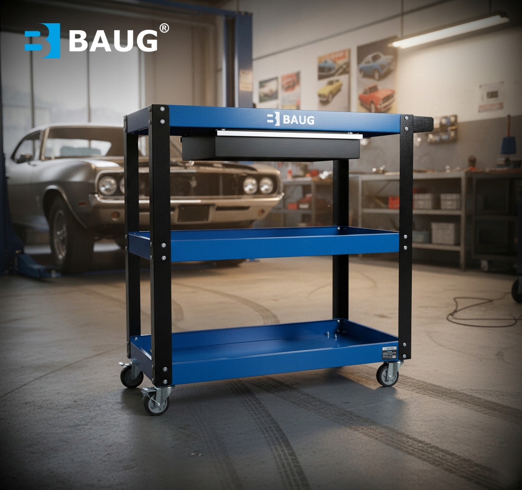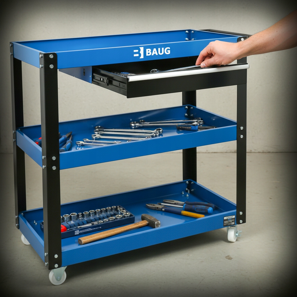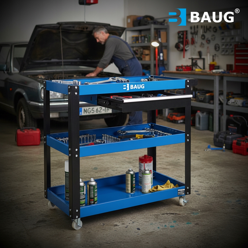 Профессиональная и универсальная тележка для инструментов от BAUG — это практичное решение для мастерских, автосервисов, ремонтных мастерских, а также для любителей DIY, работающих в гараже.