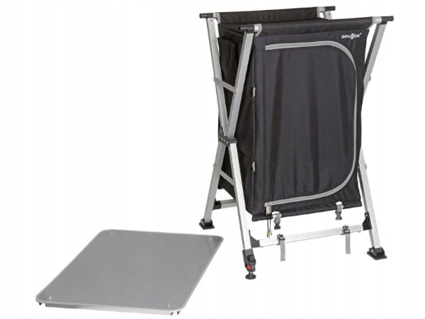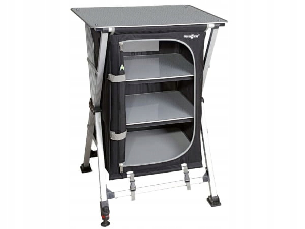 Новая концепция многофункционального шкафа крестовой конструкции из трубчатого алюминия. 1 регулируемая по высоте ножка, поворотная и такого размера, чтобы не проваливаться в мягкую почву. Оснащен большим отделением с тремя полками и столешницей из усиленного МДФ. Шкаф отличается высокой прочностью, универсальностью и современным внешним видом. Идеально подходит для использования в тамбуре, палатке или тенте каравана или кемпера. Чехол из очень прочного синтетического материала с двусторонним покрытием. Устойчив к истиранию, легко чистится и элегантен.
