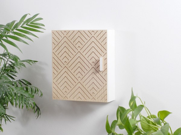 Практическая, оригинальная ключевая коробка - идеально подходит для зала, для офиса или офиса. Декоративный, современный рисунок вырезан из шпона натурального дуба. Задняя часть коробки и боков окрашены в белый цвет.