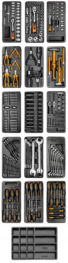 Каждый ящик имеет набивку из пеноматериала ЭВА толщиной 2 мм. Они также совместимы со всеми насадками для инструментов марки NEO.