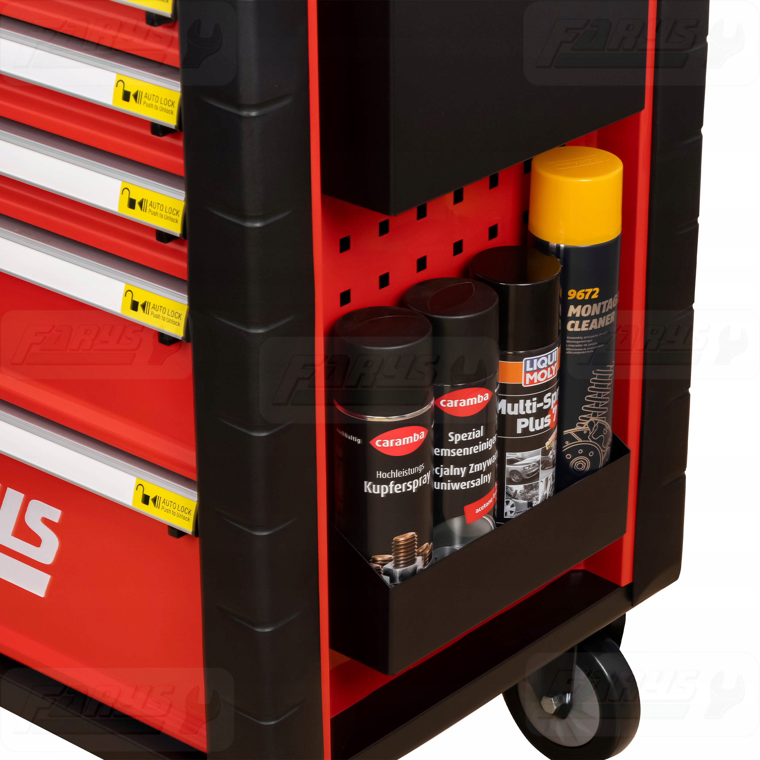 Дополнительным преимуществом являются аксессуары, повышающие удобство использования. В одном из ящиков находится пластиковый лоток с отделениями, который идеально подходит для хранения мелких предметов, таких как шурупы, гайки или биты. Сбоку от тележки вы найдете полку с вешалкой для бумаги, а с противоположной стороны две полки — одна для документов, другая для аэрозолей.