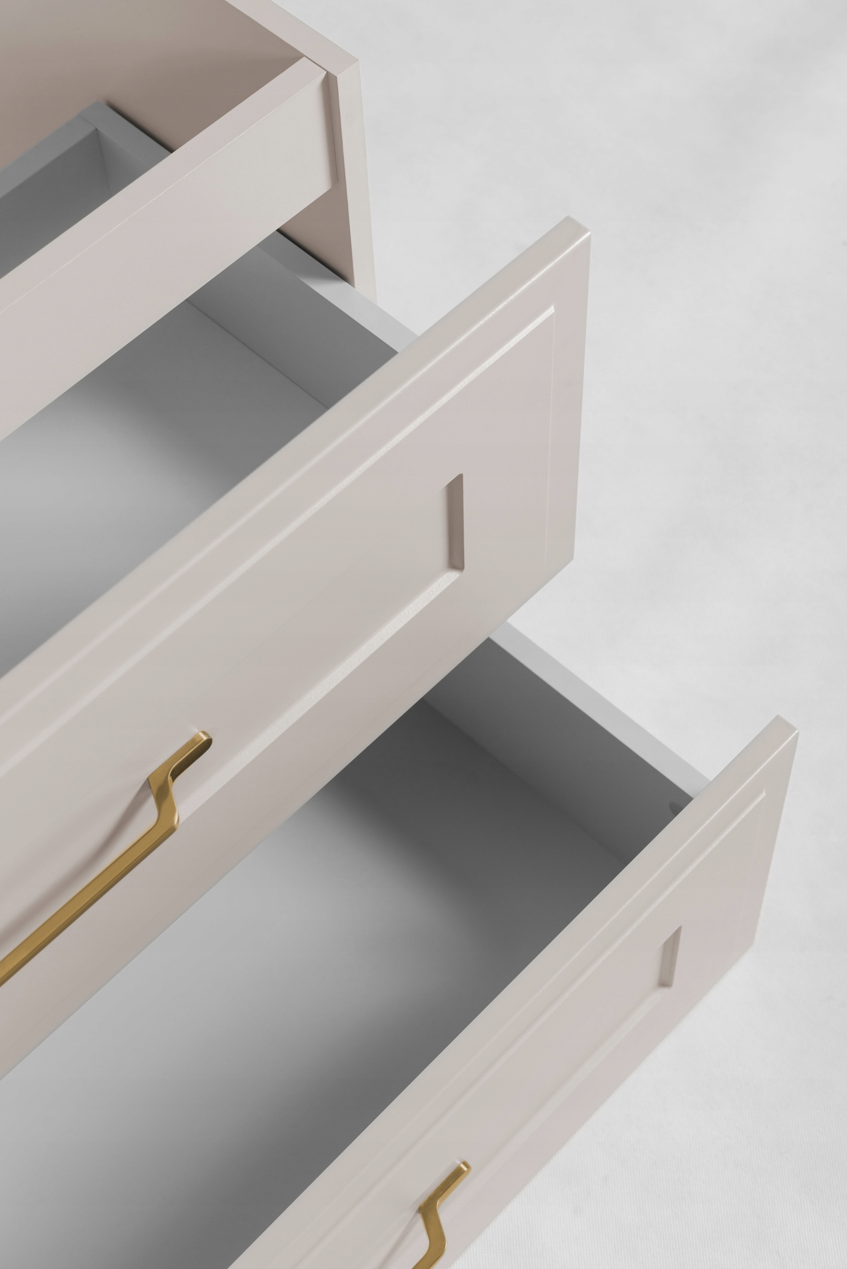 тонкие цвета , такие как кашемир или элегантный черный или белый , идеально подходит для различных интерьеров, придавая им уникальный символ . Стильная, широкая рама на фронтах подчеркивает современный внешний вид шкафов, а металлические ручки в золото дают им роскошную отделку .