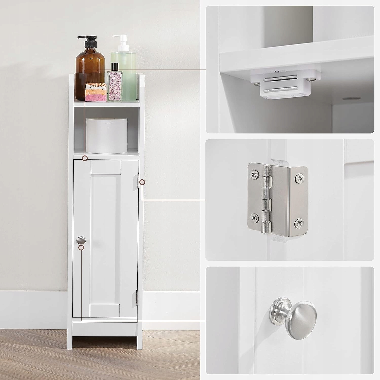 Функциональный и стильный узкий шкаф является идеальным решением для экономии места в ванной комнате. Его узкая конструкция делает его идеальным даже в небольших пространствах и изготовленной из высококачественного МДФ, представляет прочную и эстетическую структуру. Регулируемые полки за дверью как вверх, так и вниз с возможностью регулировки высоты на 3,2 см являются ключевой особенностью этого шкафа, что позволяет вам адаптировать его интерьер к индивидуальным потребностям. Две открытые полки будут идеальными для размещения украшений или хранения объектов, которые должны быть у вас под рукой, и благодаря минималистскому дизайну, шкаф идеально использует доступное пространство и добавляет элегантность и современность в интерьер. Размеры: 18 x 20 x 80 (ширина x глубина x Высота