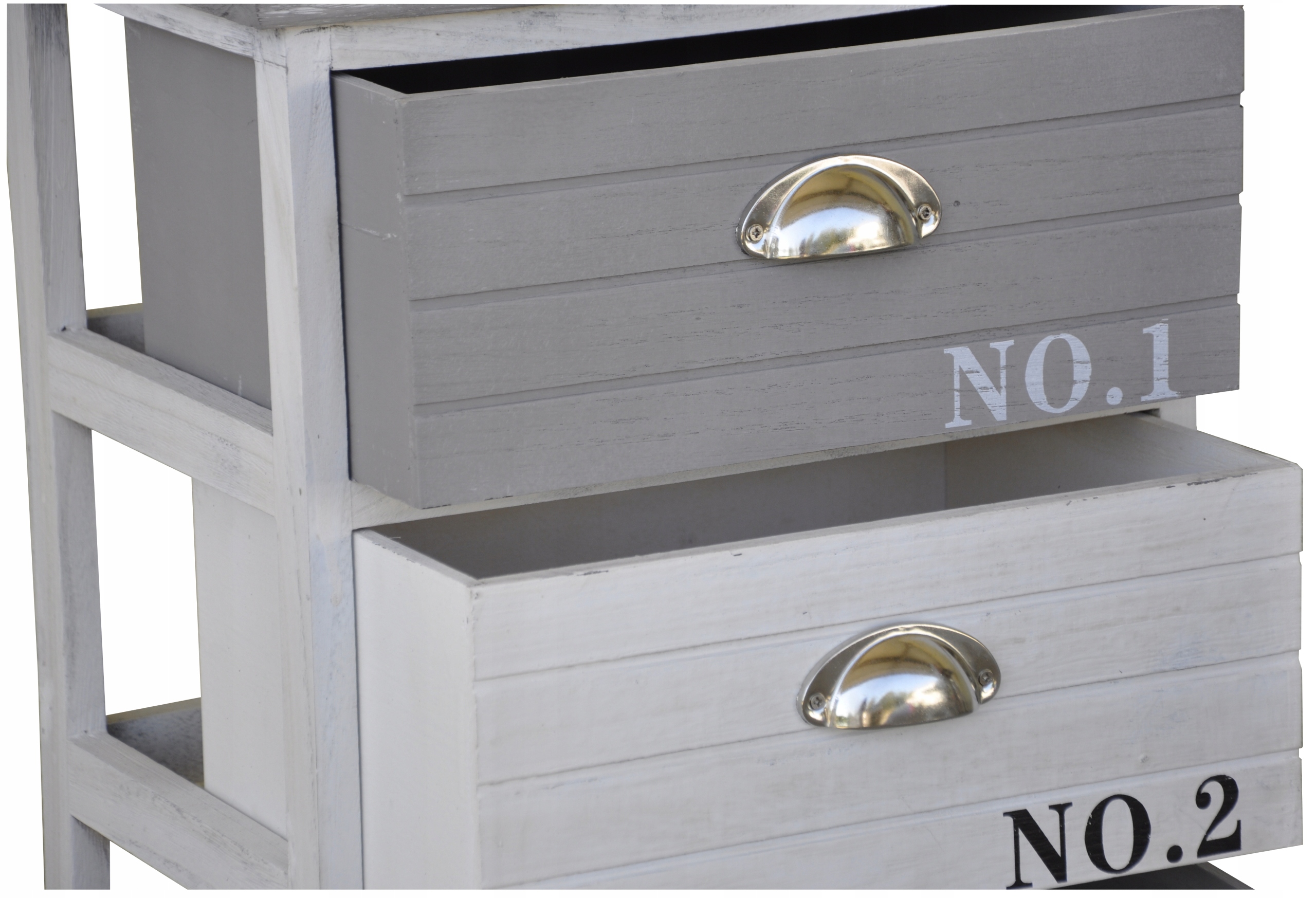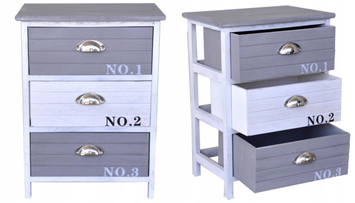 Шкаф имеет три пронумерованных ящика с металлической ручкой.