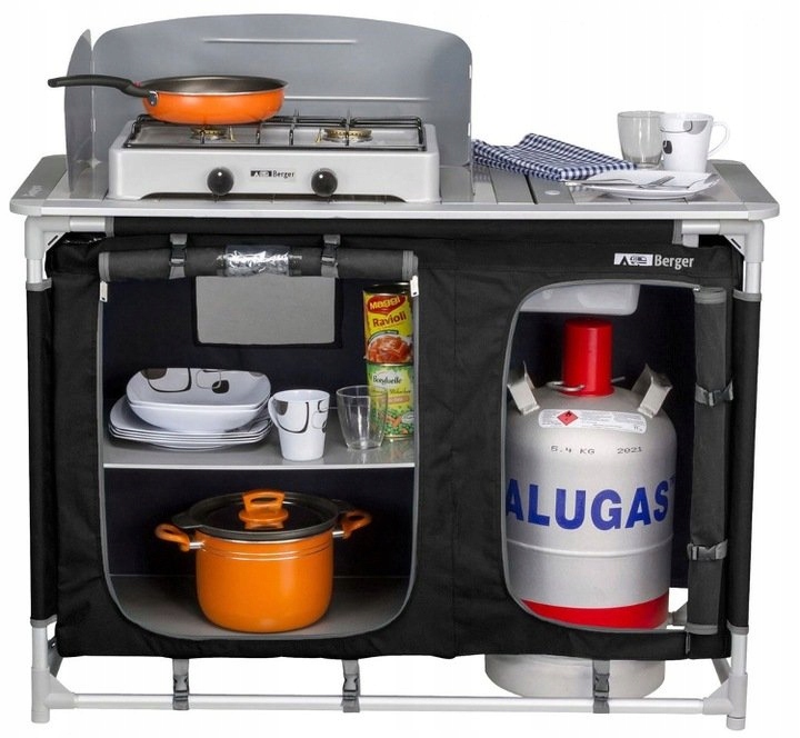 Складной дорожный шкаф Berger — идеальное решение для кемпинга или палаточного лагеря. Изготовлен из высококачественных материалов, легко чистится, быстро собирается и имеет стабильную и прочную конструкцию. Оснащен вместительными шкафами, позволяющими хранить необходимые вещи, такие как посуда и кухонный инвентарь. Столешница с местом для плиты гарантирует комфортное приготовление еды на свежем воздухе благодаря ветрозащите. Кроме того, тумба оснащена съемной пластиковой чашей, которую можно использовать как раковину. Алюминиевые ножки гарантируют устойчивость даже на неровных поверхностях. Шкаф разбирается всего за несколько шагов, а благодаря удобной сумке транспортировать шкаф очень удобно.