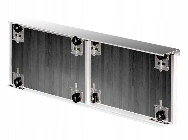 Комплексная система для шкафа-купе максимальной шириной 180 см (для более узких направляющие необходимо соответственно укоротить). Комплект для двухстворчатого шкафа. Подходит для мебельного щита толщиной 18 мм. Алюминиевые профили, в цвете согласно аукциона.