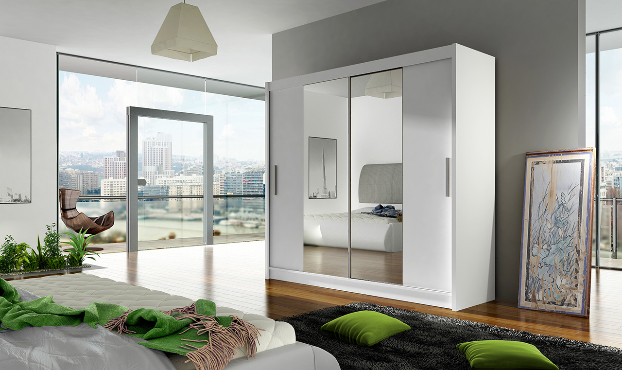 Двухдверный шкаф с системой раздвижных дверей, облегчающий повседневное использование. Современный, функциональный и элегантный. Предназначен для безопасного хранения одежды и других личных вещей. Идеально подходит для спальни, гостиной или холла. В гардеробе есть длинные вертикальные зеркала, чему наверняка будет рада каждая женщина.