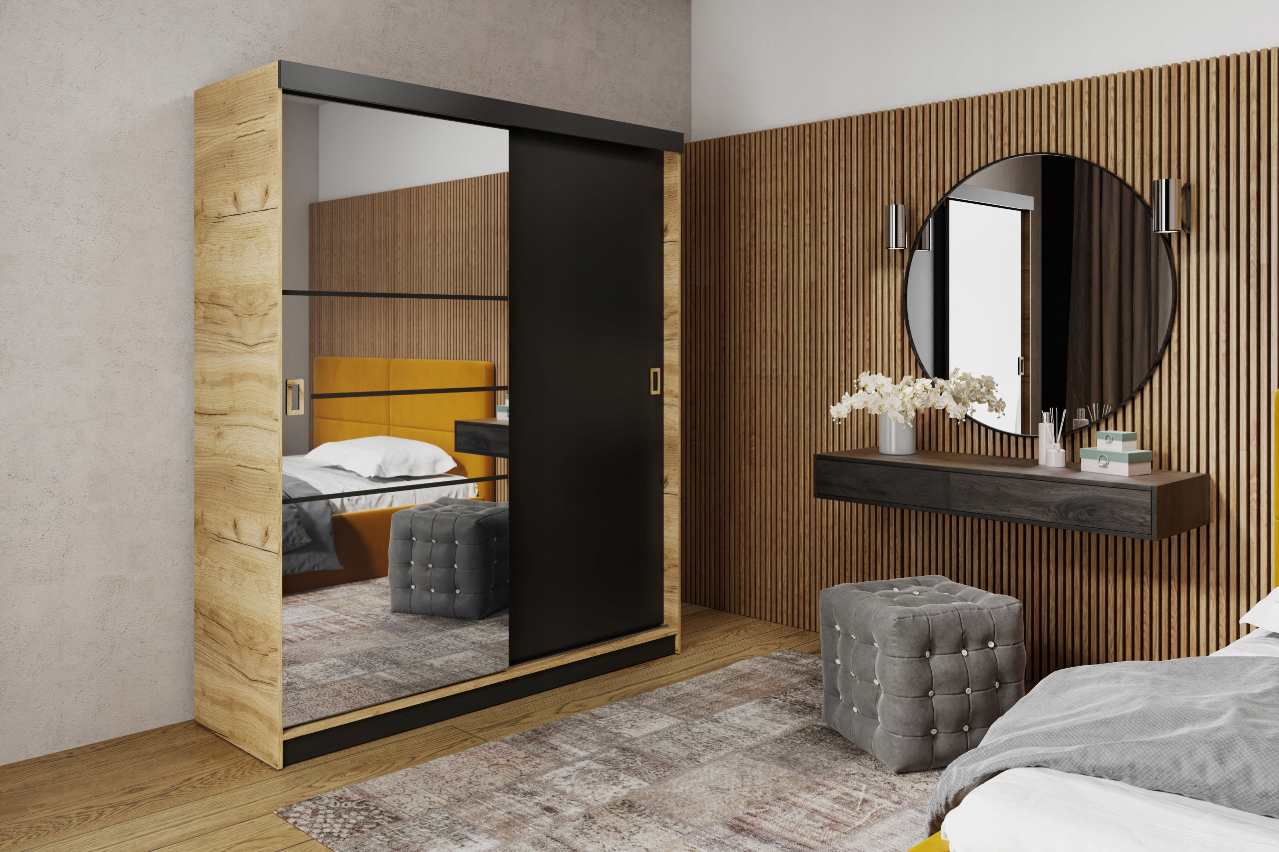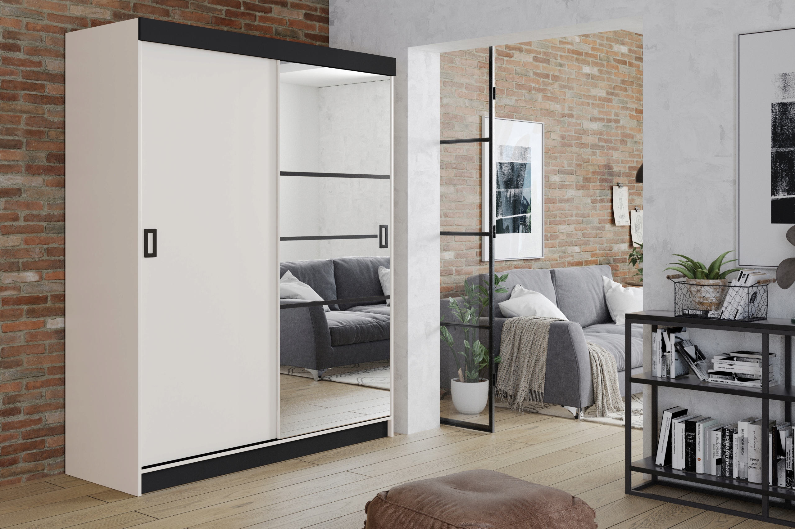 - Зеркало гардероба декорировано черными полосками для самостоятельной сборки.