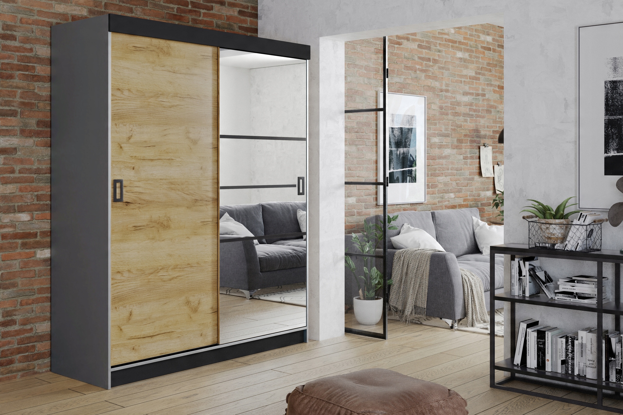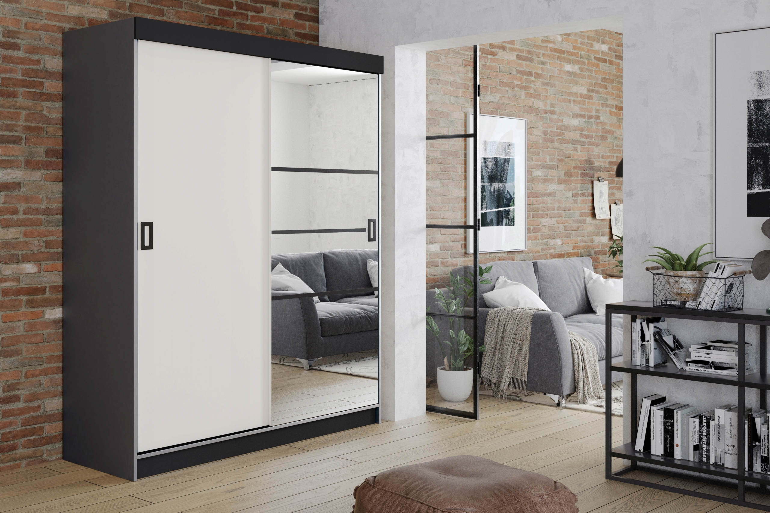 - Зеркало гардероба декорировано черными полосками для самостоятельной сборки.