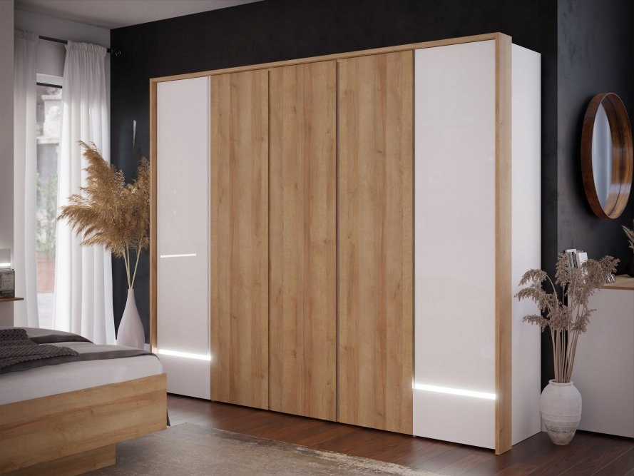 Шкаф 4-дверный из коллекции LENYBELARDO идеально подойдет для спальни. Имеет хорошо организованное пространство: 2 ящика, штанга для одежды и 3 полки. Встроенная светодиодная подсветка придаст помещению шарма и привлекательности.