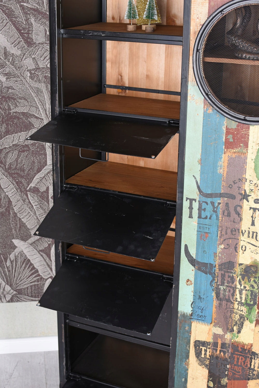 Этот шкаф, безусловно, принесет элегантность в ваш дом благодаря сочетанию элегантных блэк -метал и богатых деревянных элементов. Этот шкаф, оснащенный четырьмя ящиками и дверями, окрашенными в техасские надписи и узоры с мотивом быка, отражает атмосферу стиля чердака. Идеально подходит для современной гостиной или молодежной комнаты, шкаф для гостиной в черном металле в стиле чердака станет уникальным дополнением к вашему декору, что действительно отражает изысканность.