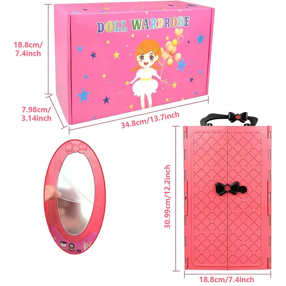 Переносной кукольный шкаф размером 12,2 х 7,4 дюйма (31 х 19 см) стильно оформлен, украшен несколькими крючками и оснащен 6 полками. Одев кукол, дети могут организовать и хранить кукольную одежду и аксессуары в функциональных ящиках и шкафах!