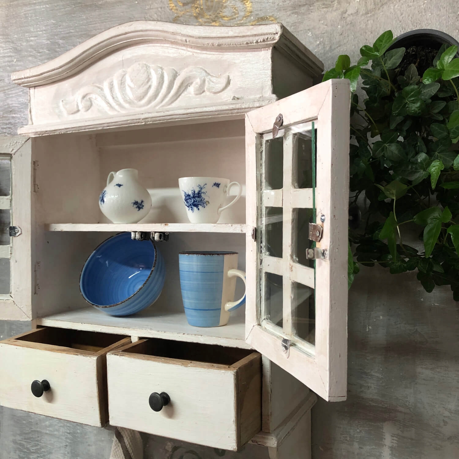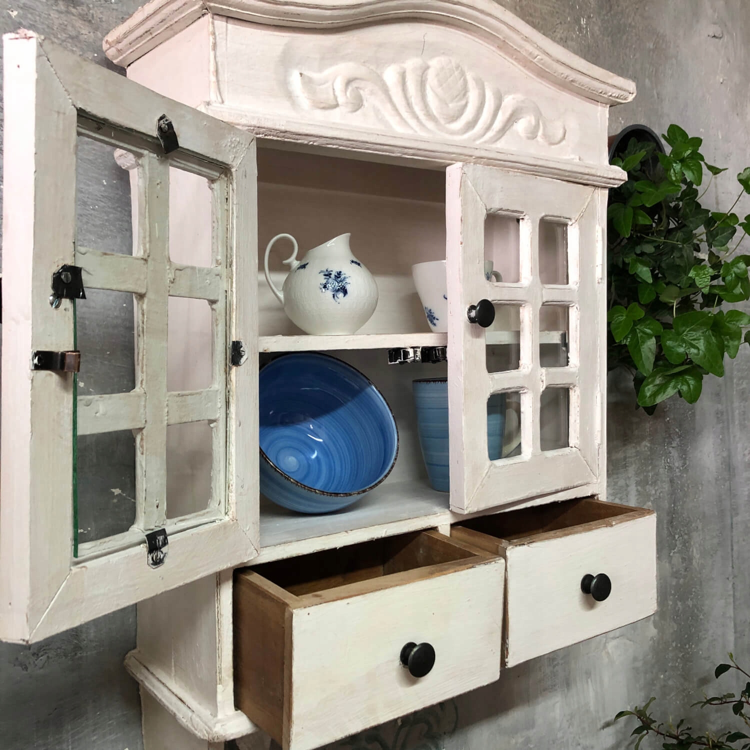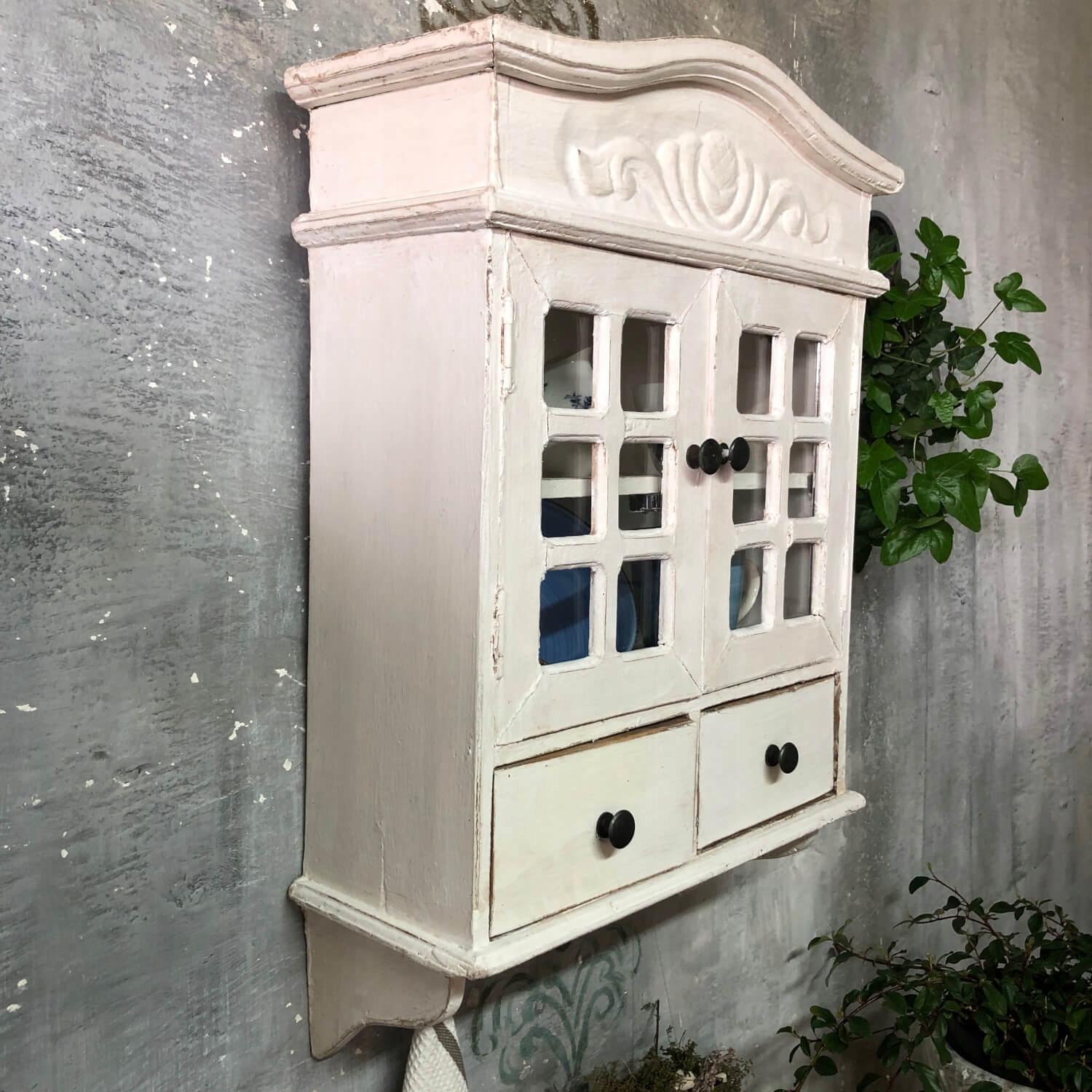 Белый подвесной шкаф в стиле ретро с очками и деревянными ящиками