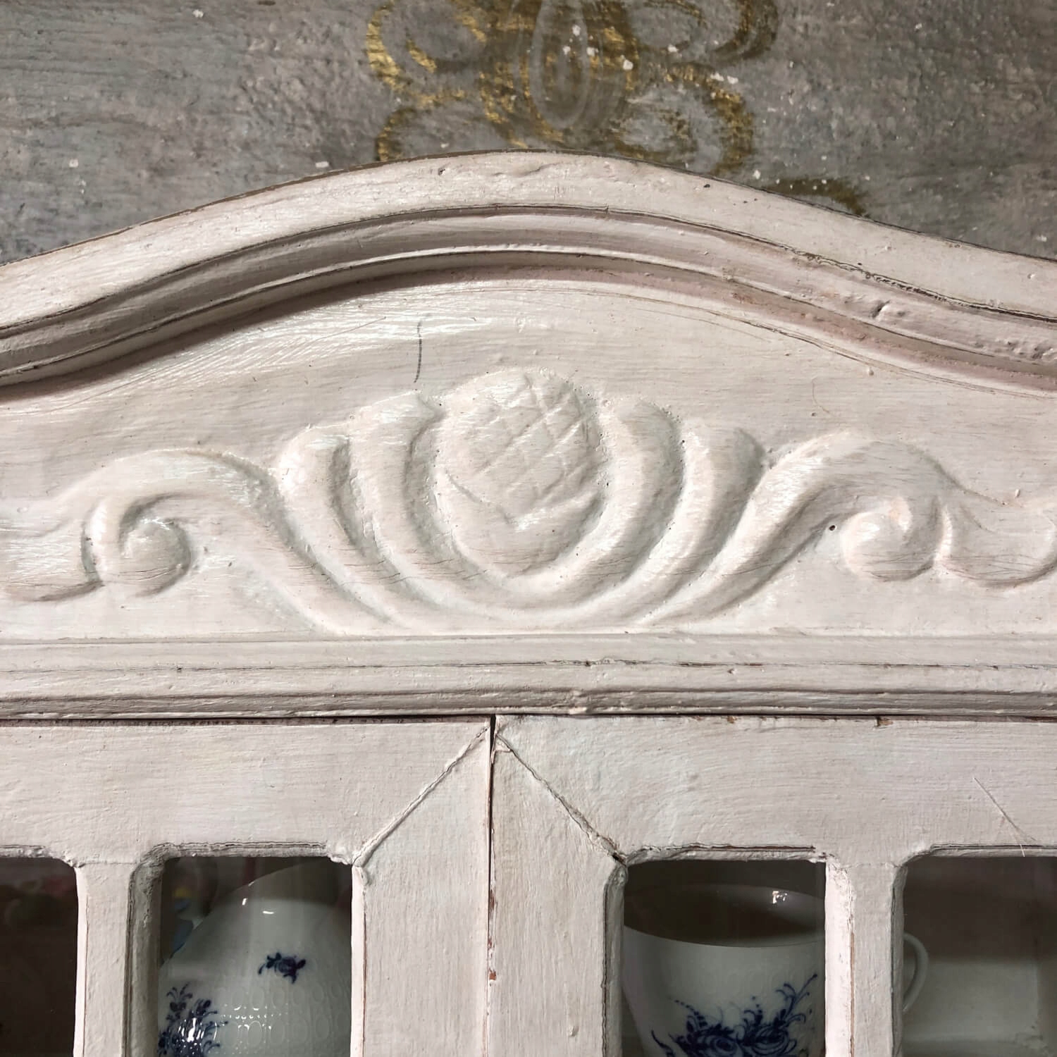 На каждом шкафу имеются потертости, нанесенные вручную, и небольшие дефекты окраски. Декоративная фрезеровка наверху придает мебели шик и изысканность. Это не массовое производство – это вещь с характером.