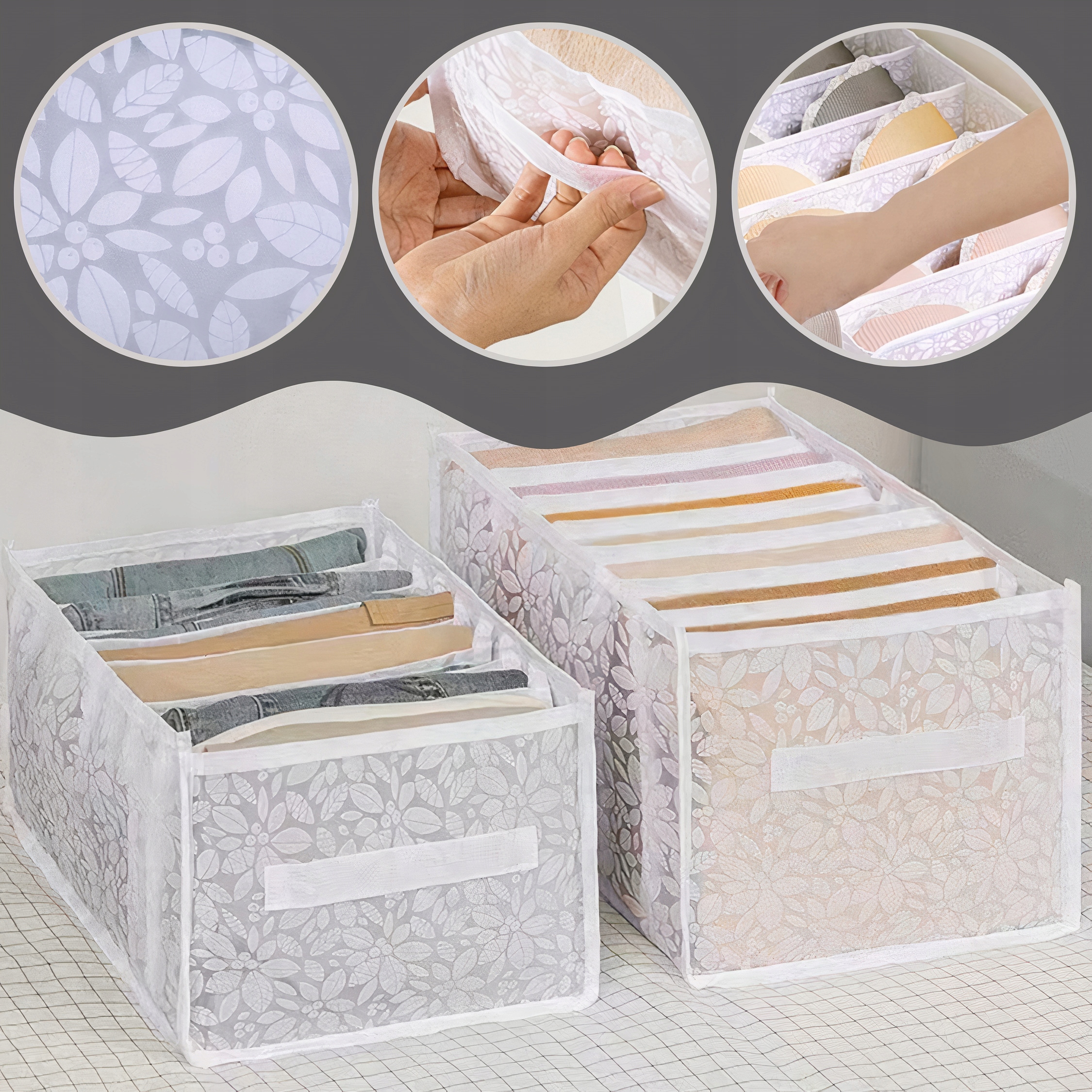 Эстетичность органайзера для гардероба или тумбы для бюстгальтеров – одна из его отличительных особенностей. Он имеет рельефный цветочный узор, который придает ему элегантности и очарования. Этот нежный узор носит повседневный характер и вписывается в различные стили дизайна интерьера.