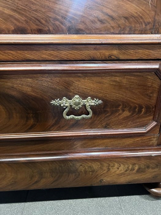 Мебель восхищает красивой текстурой дерева, богатой резьбой и большим зеркалом со скошенной кромкой в двери. Внизу вместительный ящик с оригинальными латунными ручками.