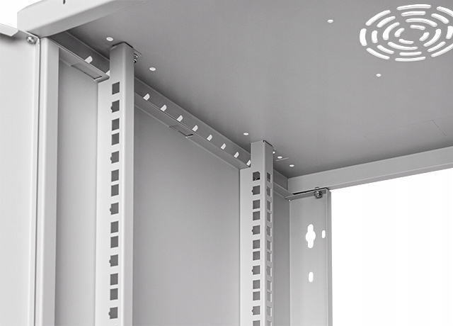 Шкаф высотой 12U оснащен дополнительными вентиляционными отверстиями в верхней и нижней части шкафа, спереди и по бокам, благодаря чему циркуляция воздуха внутри шкафа будет эффективной. .