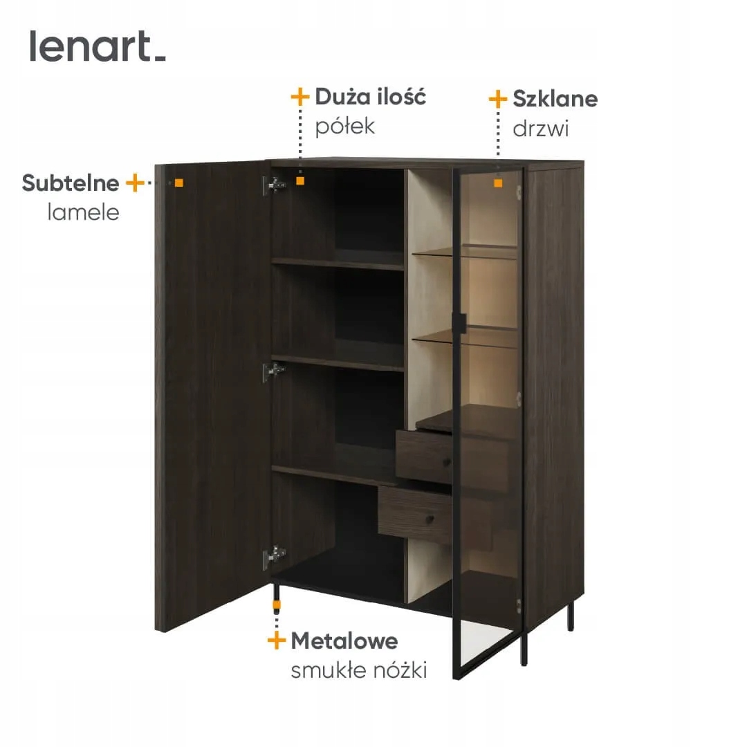 Современная витрина в первую очередь отличается своей вместительностью. Благодаря множеству полок и ящиков здесь достаточно места для хранения различных предметов, например, книг, украшений, сувениров или посуды. Шкаф-витрина PE-06 также имеет встроенную подсветку, которая дополнительно подчеркивает хранимые предметы и их красоту.