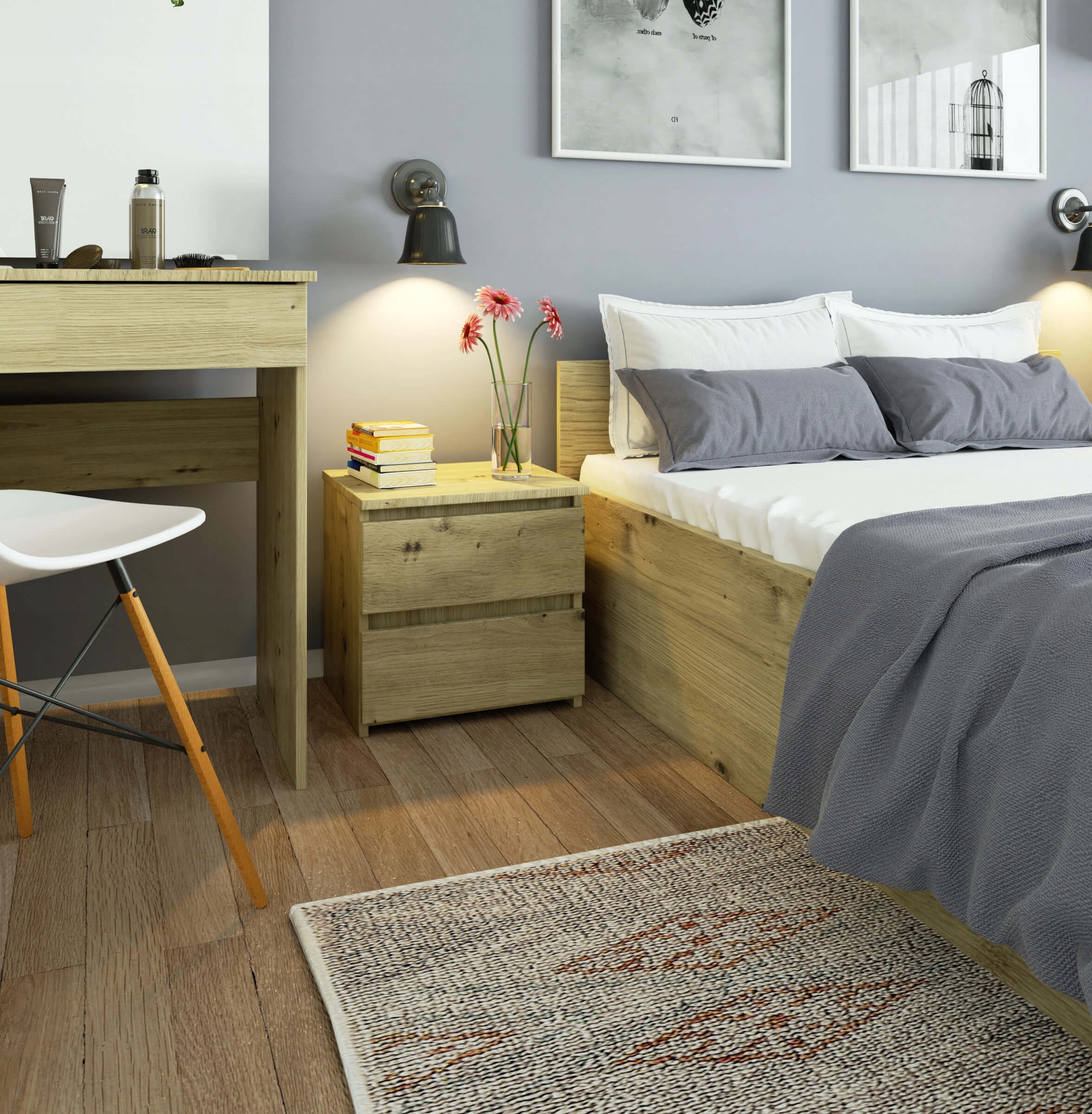Мебель изготовлена из ламинированного картона, высокоустойчивого к истиранию. Это долговечный продукт с прочной конструкцией, который наверняка удовлетворит даже требовательных клиентов. Ящики передвигаются по металлическим роликовым направляющим, а видимые края тумбочки покрыты кромкой из АБС-пластика.