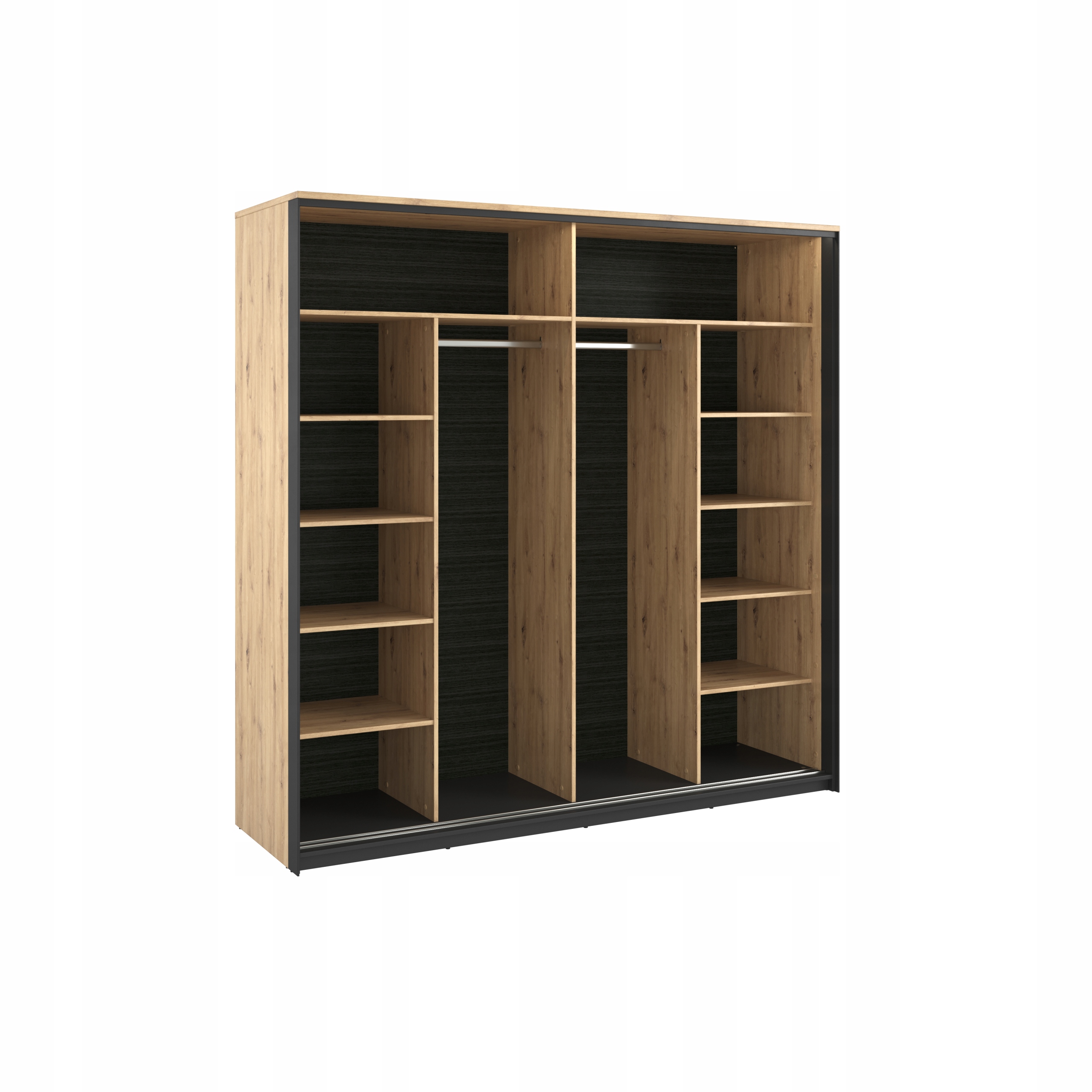 Очень вместительный и функциональный шкаф-купе с двумя раздвижными дверями для спальни в стиле лофт. Его индустриальный характер подчеркивается сочетанием декора цвета дерева с черной рамой, служащей опорой. Разместив большое зеркало на одном из фасадов, он визуально увеличивает комнату и делает ее просторнее.