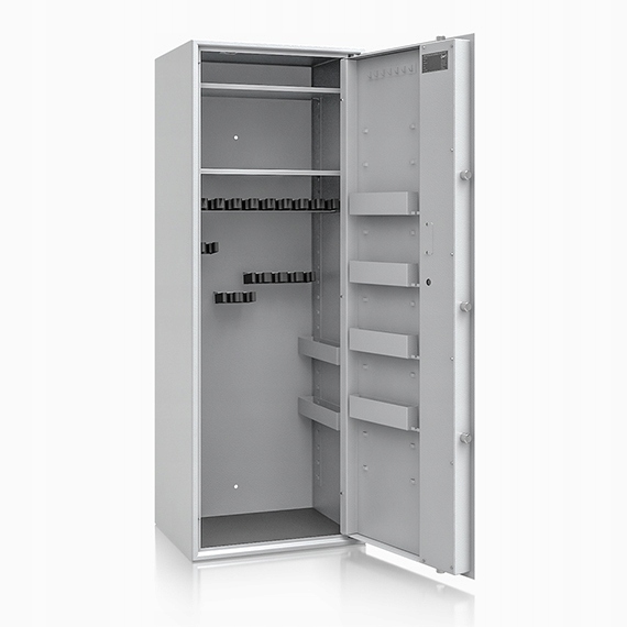- Сейф имеет 17 длинных/коротких держателей для оружия, две регулируемые полки в верхней части сейфа и четыре полки на двери для пистолетов, боеприпасов или других ценностей.