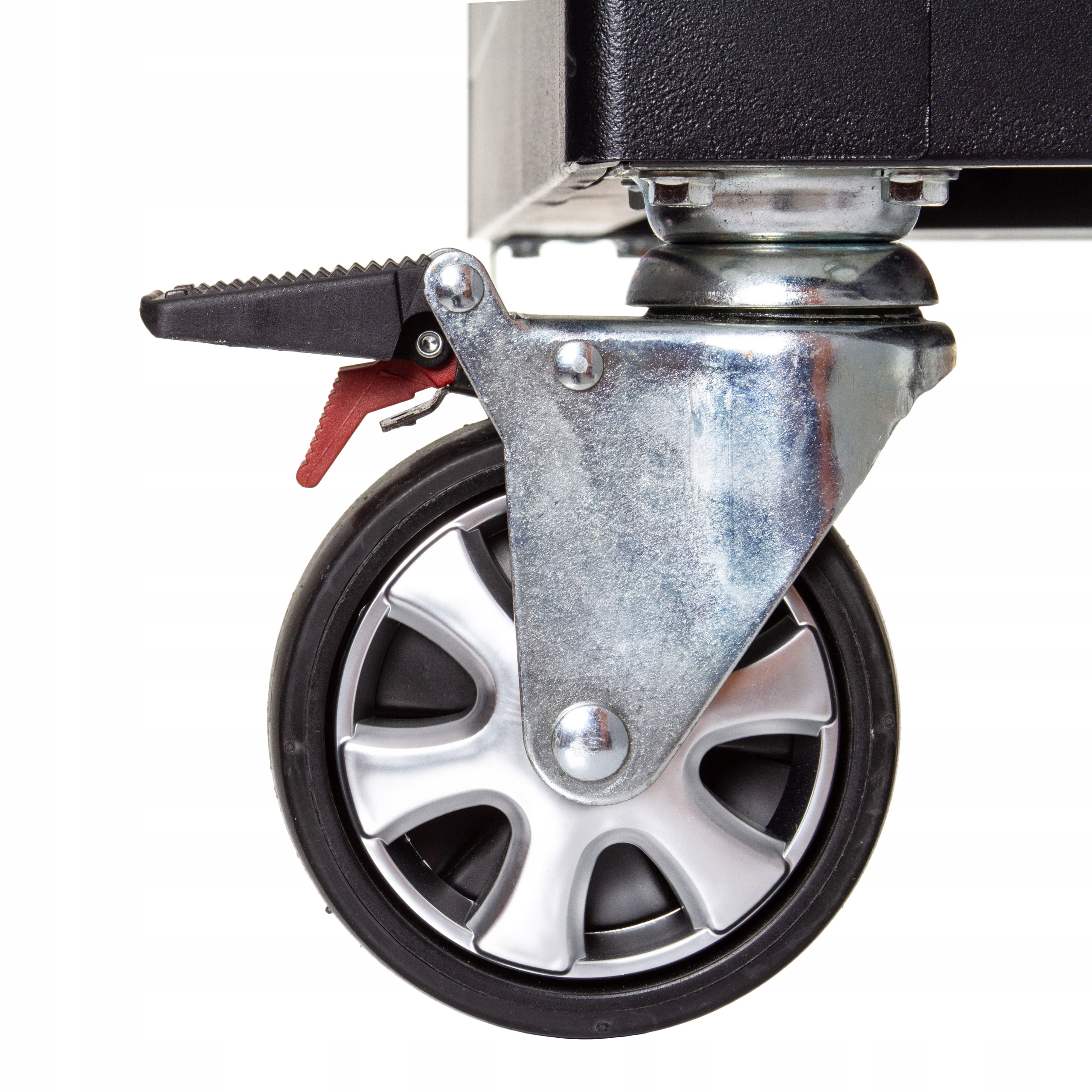 жесткие ролики, в том числе 2 поворотных, облегчающие маневрирование шкафа. Тележка для мастерской оснащена сильным тормозом, с помощью которого мы можем остановить шкаф в фиксированном положении.
