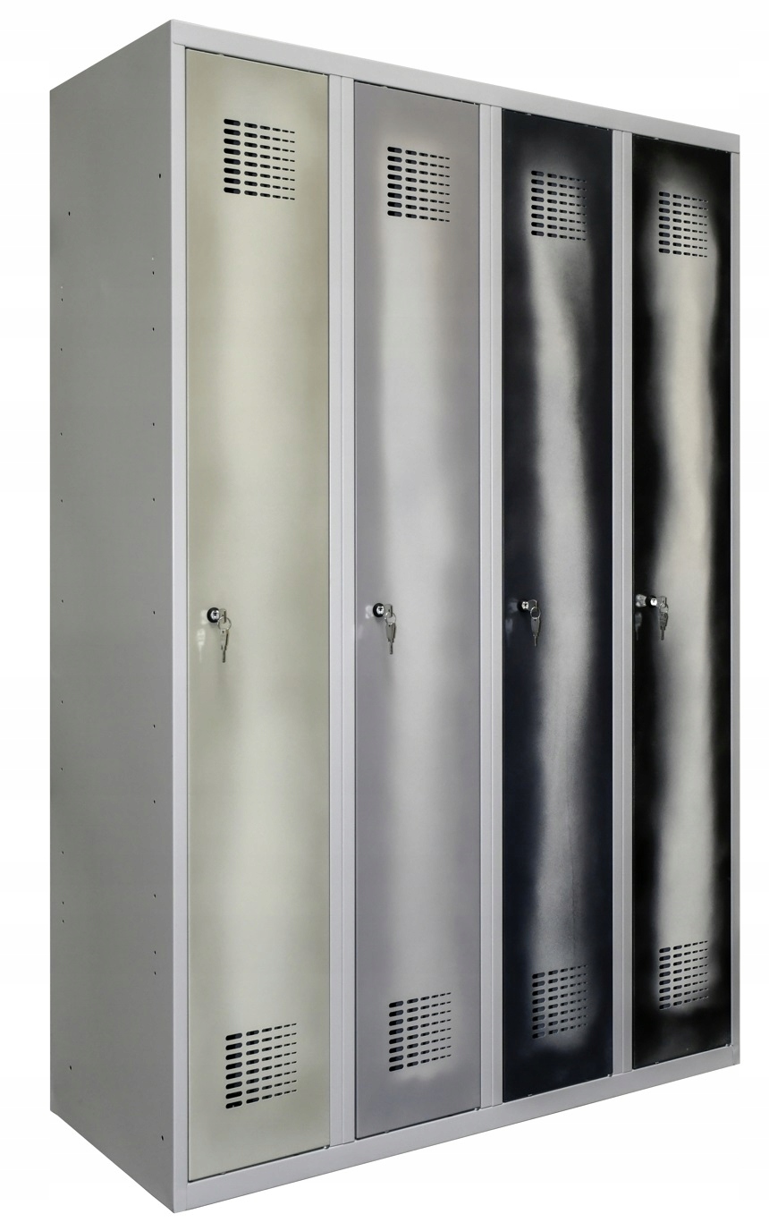 Современные шкафчики для охраны труда и техники безопасности с четырьмя отделениями, ТИП sus 322, in wemo, с самой современной производственной линии в Европе, Malow, размеры 180x60x50см, четырехкамерные, ширина камеры 30см x высота 90см. Шкафы изготовлены из холоднокатаного листового металла, сварены точечной сваркой, двери со специальным усилением, гарантирующим жесткость конструкции. В дверцах шкафа имеются современные вентиляционные отверстия с зарегистрированным знаком производства, дополнительные отверстия расположены в боковых стенках. В каждом купе имеется штанга с крючками для одежды и пластиковая визитница, приклеенная к двери.