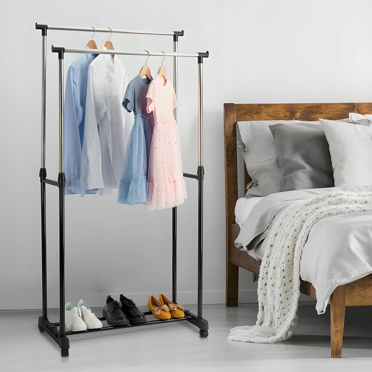 ⭐ В зависимости от ваших потребностей вешалку можно опустить или поднять — это полезная функция для длинной одежды.