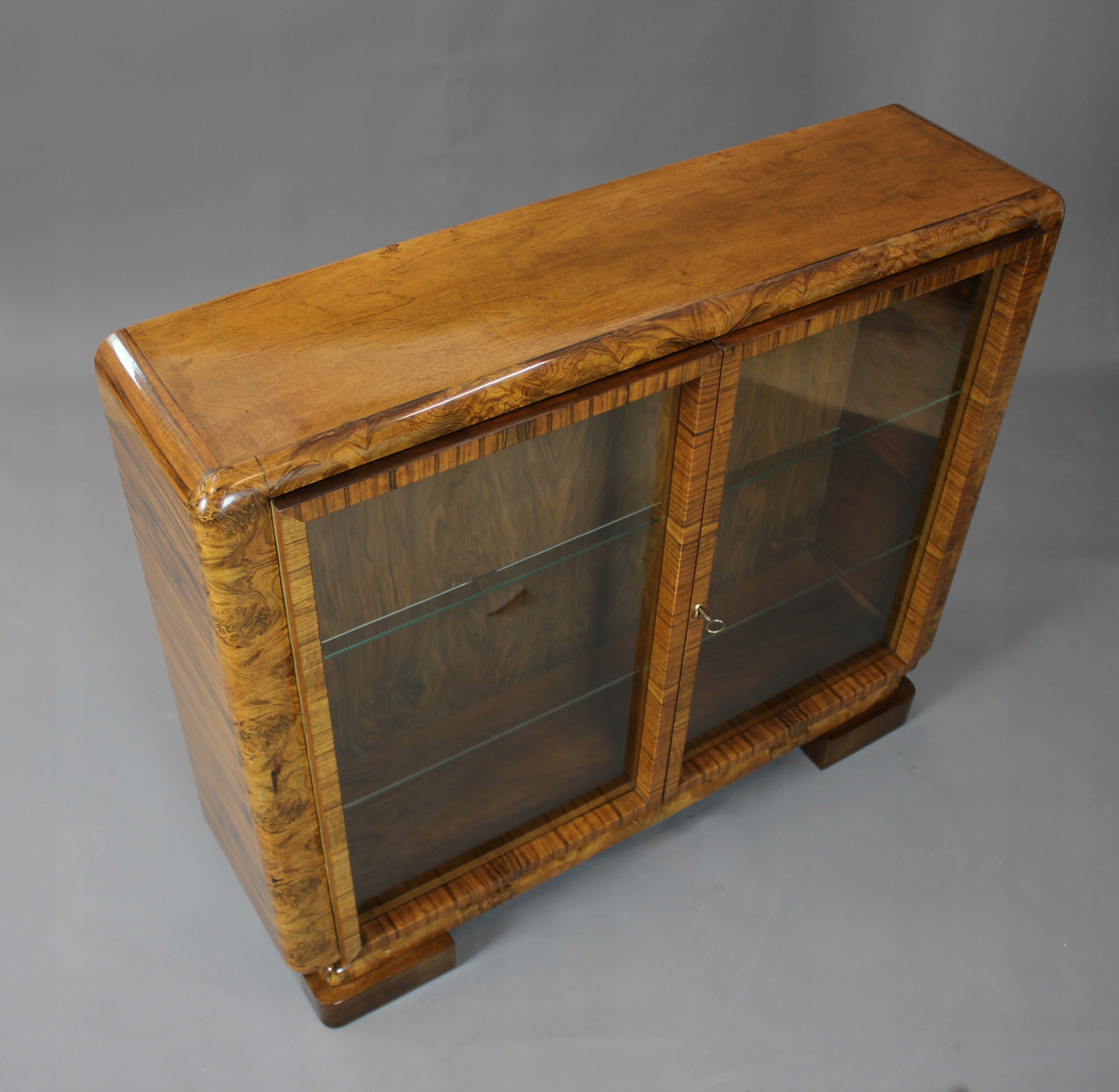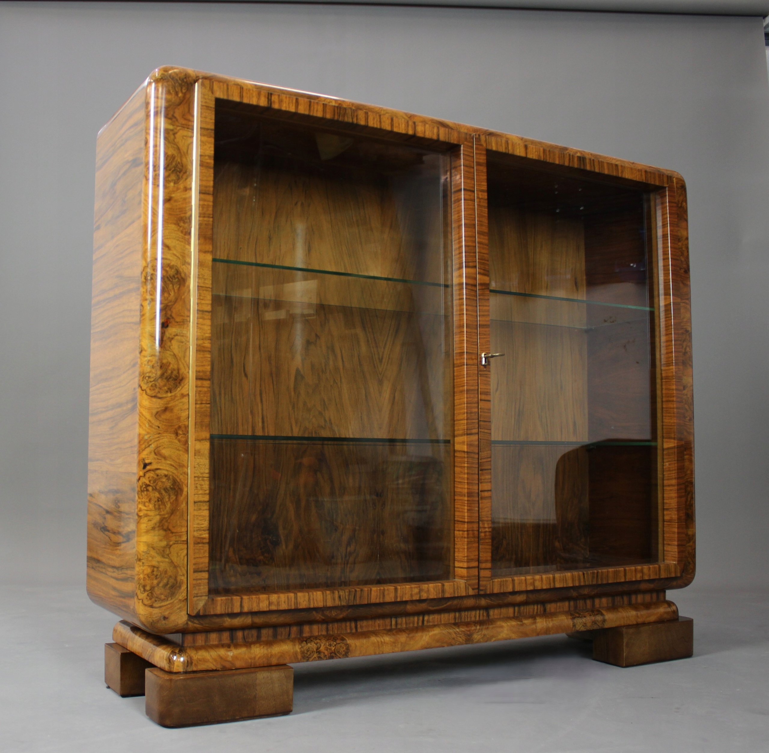 Серванка/витрина/книжный шкаф в стиле арт-деко примерно 1930-1940 годов. после тщательного обслуживания. Предмет мебели из шпона европейского ореха с ярким рисунком. Все это покрыто шеллаком, отполировано и нанесено вручную до зеркального блеска.
