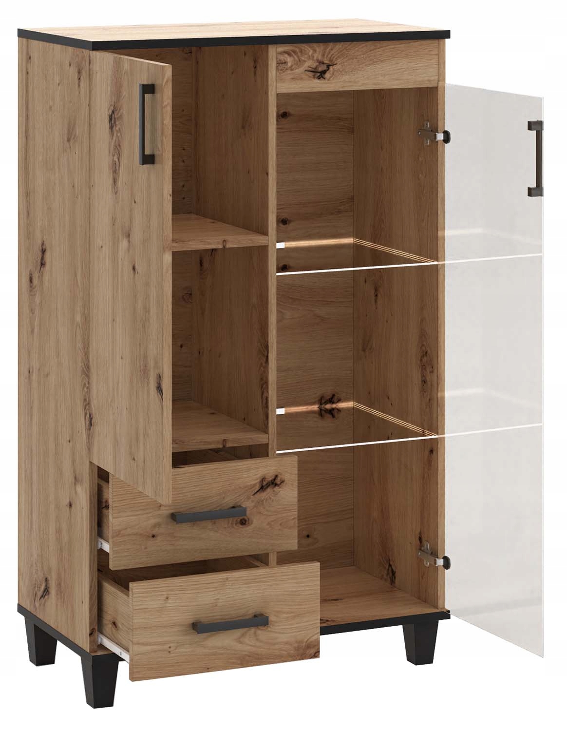 Мебель серии PARO идеально подойдет для любой гостиной или спальни. Система доступна в цвете Дуб Артизан. Мебель из качественного ламината толщиной 16 мм. Края покрыты кромкой ABS. Ручки из черного пластика. Ножки деревянные, покрытые черным лаком. 100% польский продукт. Мебель упакованная в пакеты – для самостоятельной сборки. В комплект входит понятная инструкция.