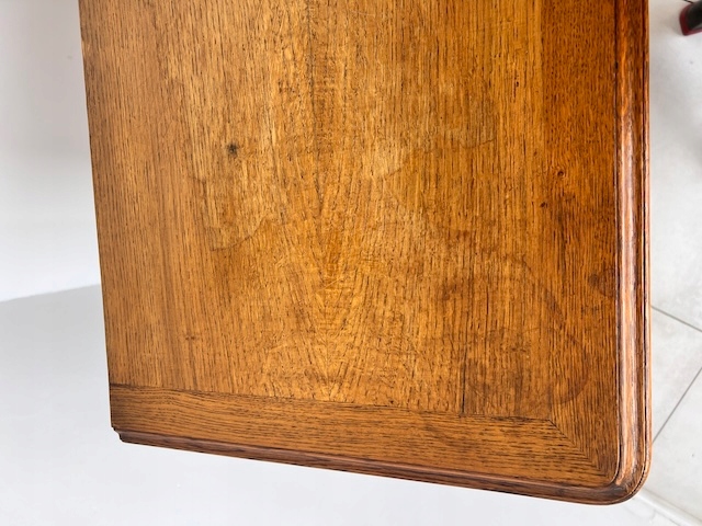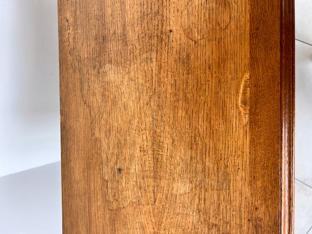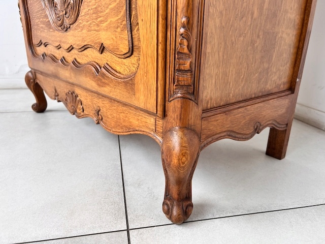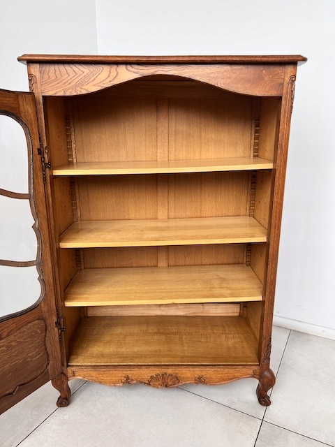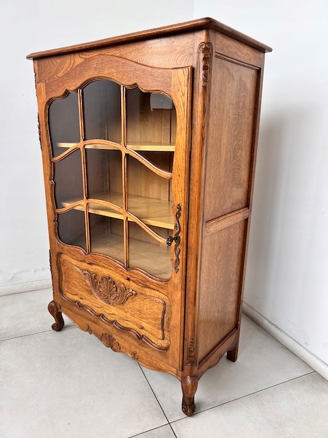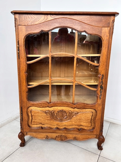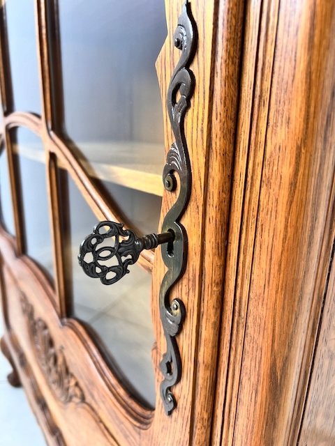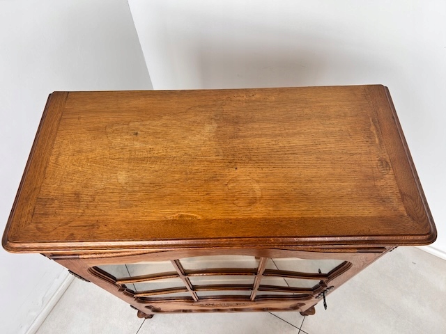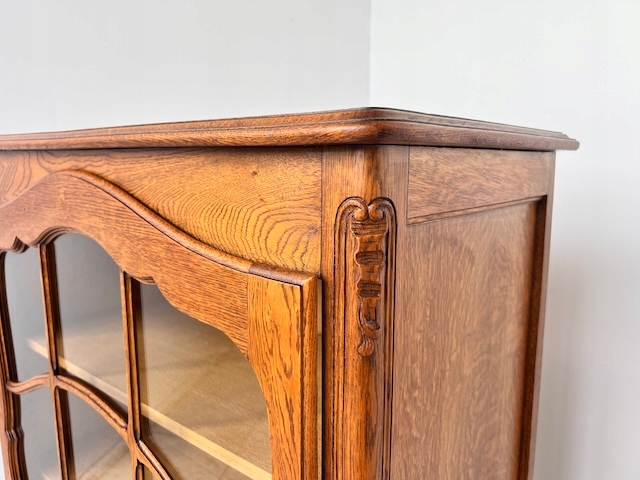 Дубовая витрина. Он выполнен в стиле Людвика. Гламурный. Он находится в хорошем состоянии. Повреждений и дефектов нет. Замок функциональный, в комплекте есть ключ. Внутри три полки, высоту которых можно регулировать. Она хорошо сохранилась. На нем видны типичные следы использования; на столешнице есть небольшие пятна. Витрина готова к установке.