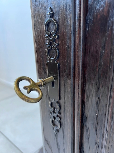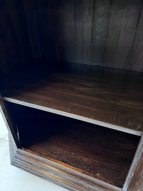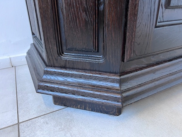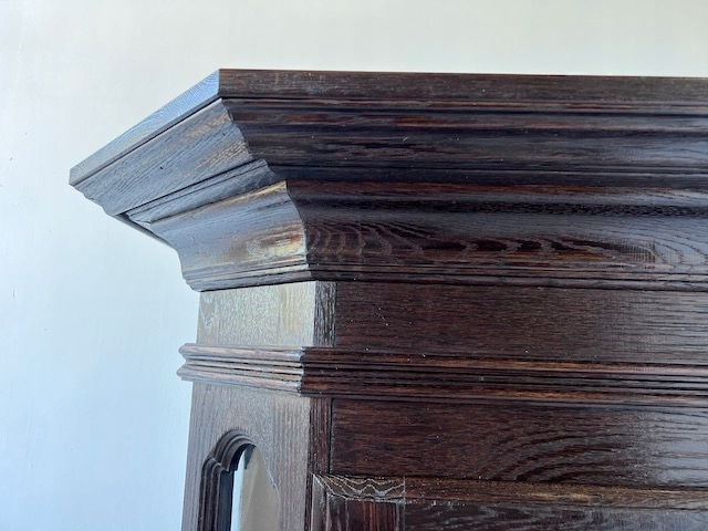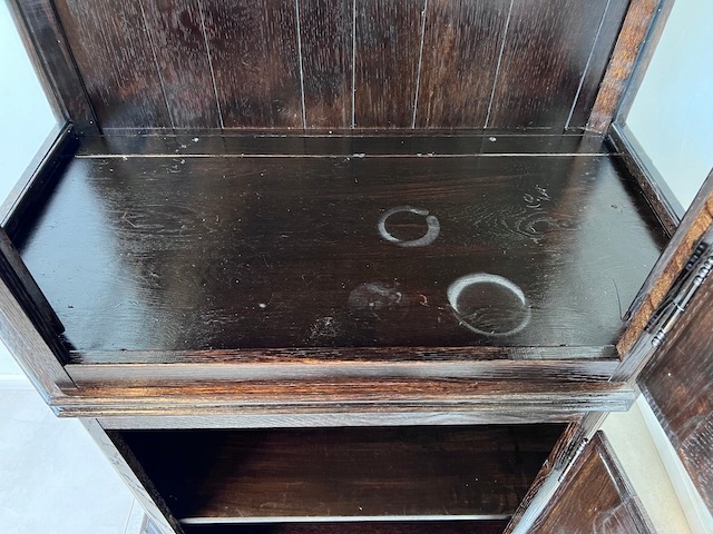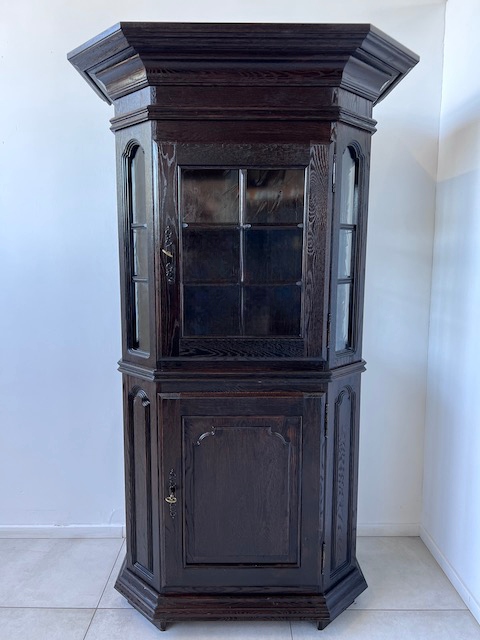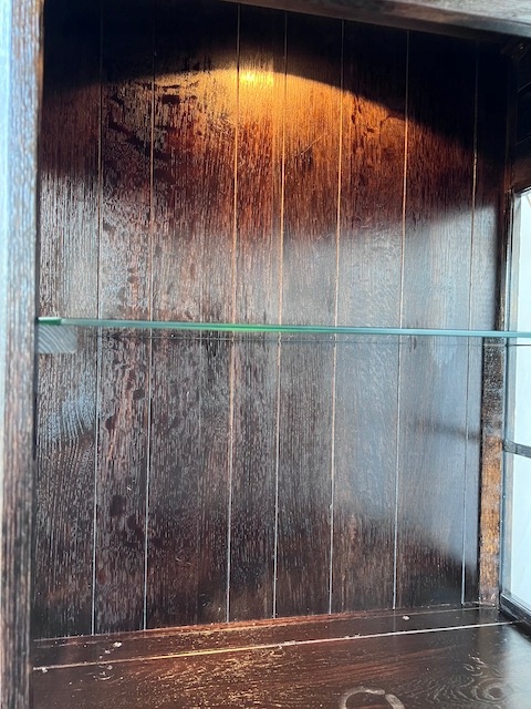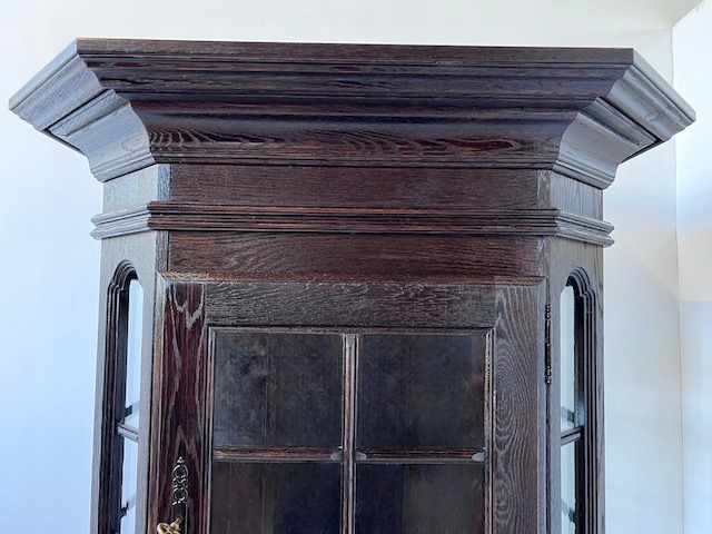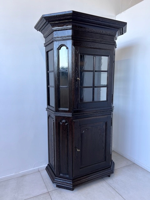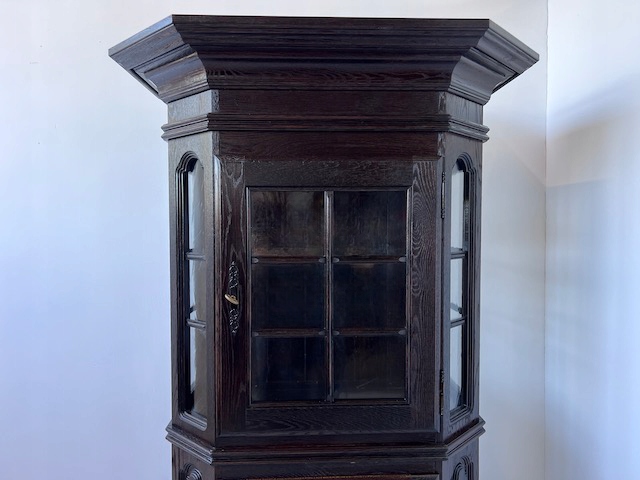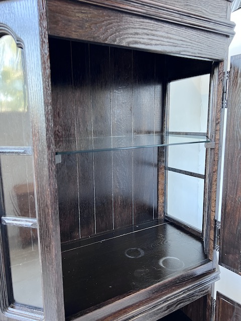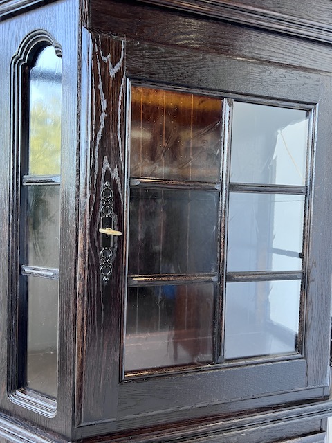 Дубовая витрина. Очень хорошенькая. Цвет темно-коричневый, почти черный. Сделан добротно, тяжело. Он находится в хорошем состоянии. Повреждений и дефектов нет. Имеет типичные следы использования. На полке в стеклянной части белые пятна. Замки функциональные, с набором ключей. В каждой части по одной полке. В застекленной части полка выполнена из стекла. Под потолком установлено освещение, которое благодаря этой стеклянной полке освещает всю площадку. Еще есть деревянная полка, которую мы вытащили. Окна в верхней части не полностью прозрачны. Трудно было запечатлеть это на камеру. По желанию заказчика и за его счет мы можем заменить их на прозрачные. Сайт состоит из двух элементов. Витрина готова к установке.