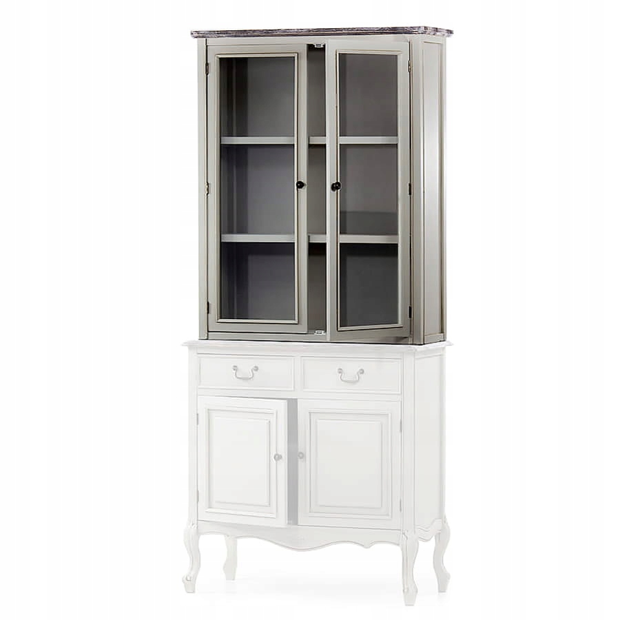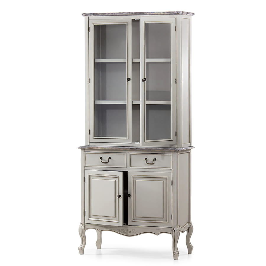 Витрина в провансальском стиле, выполненная в сером цвете. На кухне можно не только хранить нужную вам консервацию, но и выставить на витрине красивую посуду. Витрина оснащена двумя полками и стеклянной дверцей. Дверцы и ящики украшены выемками и выпуклыми полосками. Красивое целое дополняется резьбой на нижней планке и ножках. Если вы хотите изменить внешний вид своей кухни и привнести в нее уютную атмосферу, обязательно разместите в ней этот предмет мебели.