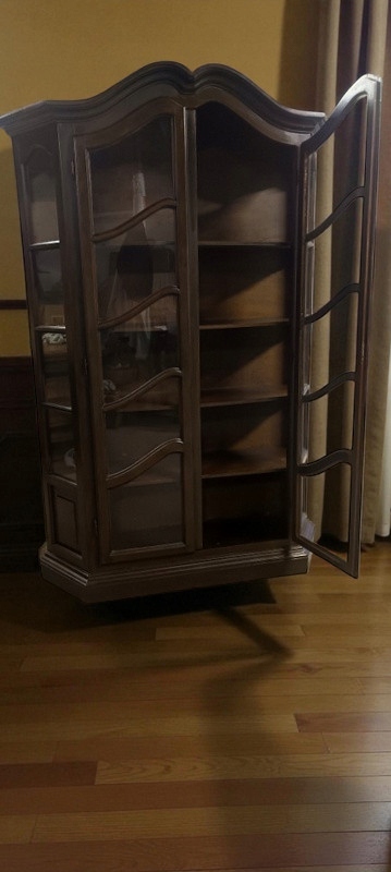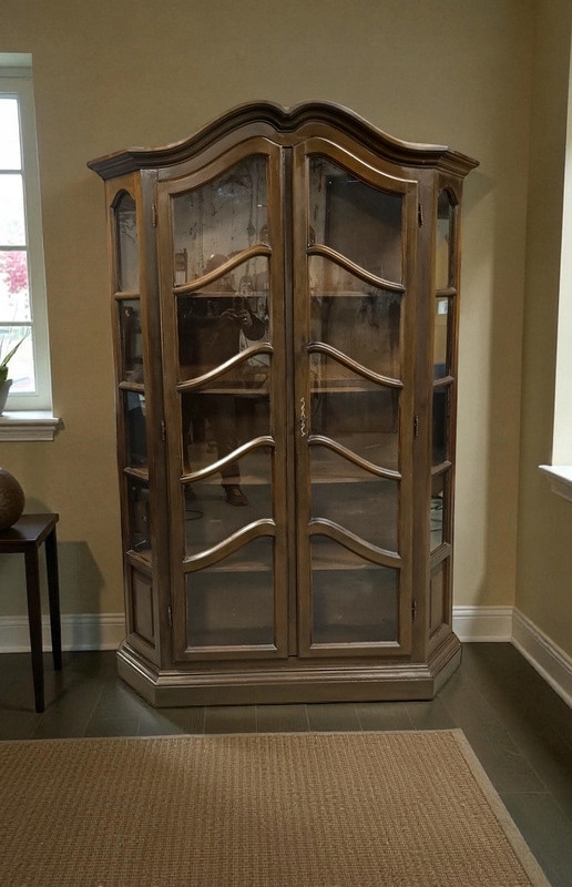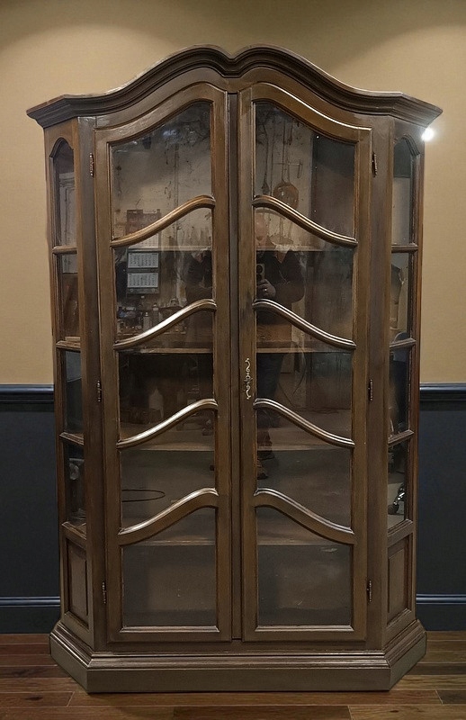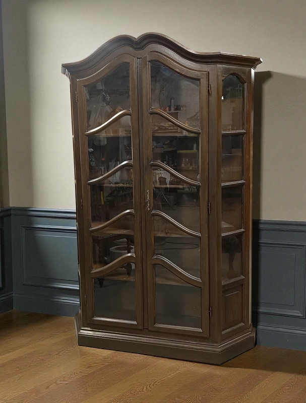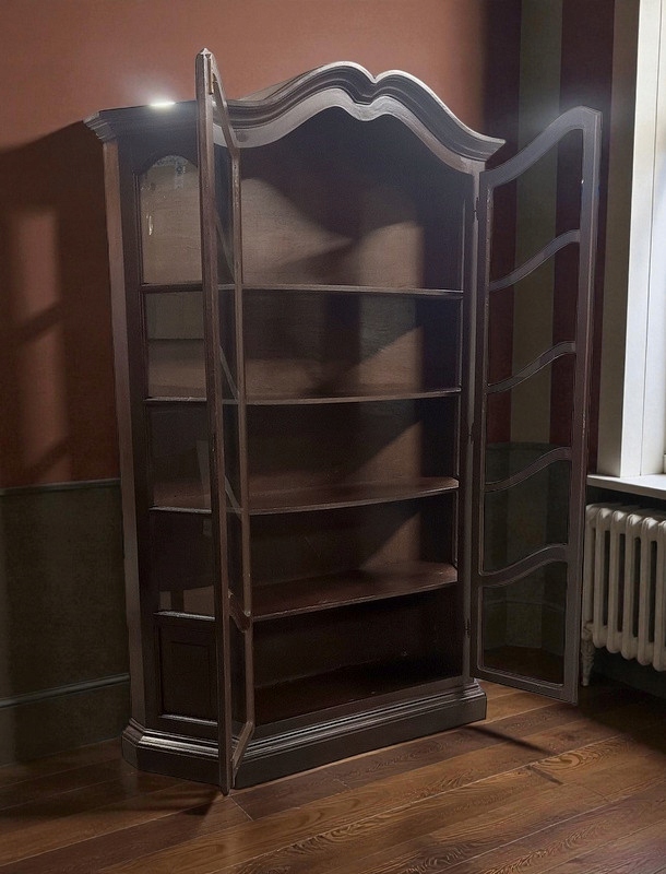 Предмет мебели, созданный с использованием мебельного искусства, сохраняющий дизайн и стиль. Имеет четыре полки. Витрина застеклена с трех сторон и отделана симметричными дугообразными фрезами. Цвет мебели тёмный орех. Несмотря на возраст (около 60-70 лет), состояние хорошее. Его можно использовать как витрину или библиотеку.