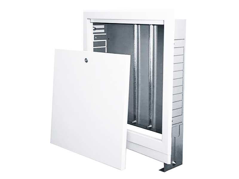 Монтаж в нише стены. Имеет съемную дверь. Замок открывается монетой или отверткой. Подвижные элементы шкафа (ножки, каркас) позволяют свободно регулировать высоту и глубину. Отверстия, образовавшиеся после снятия заглушек в боковых стенках, позволяют провести соединительные трубы внутрь шкафа.