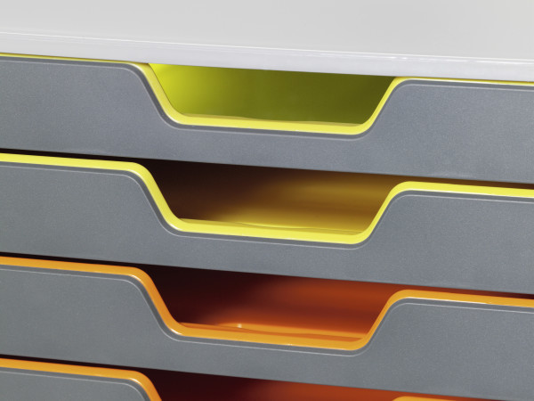 - Нежные цветные края ящиков облегчают организацию документов.