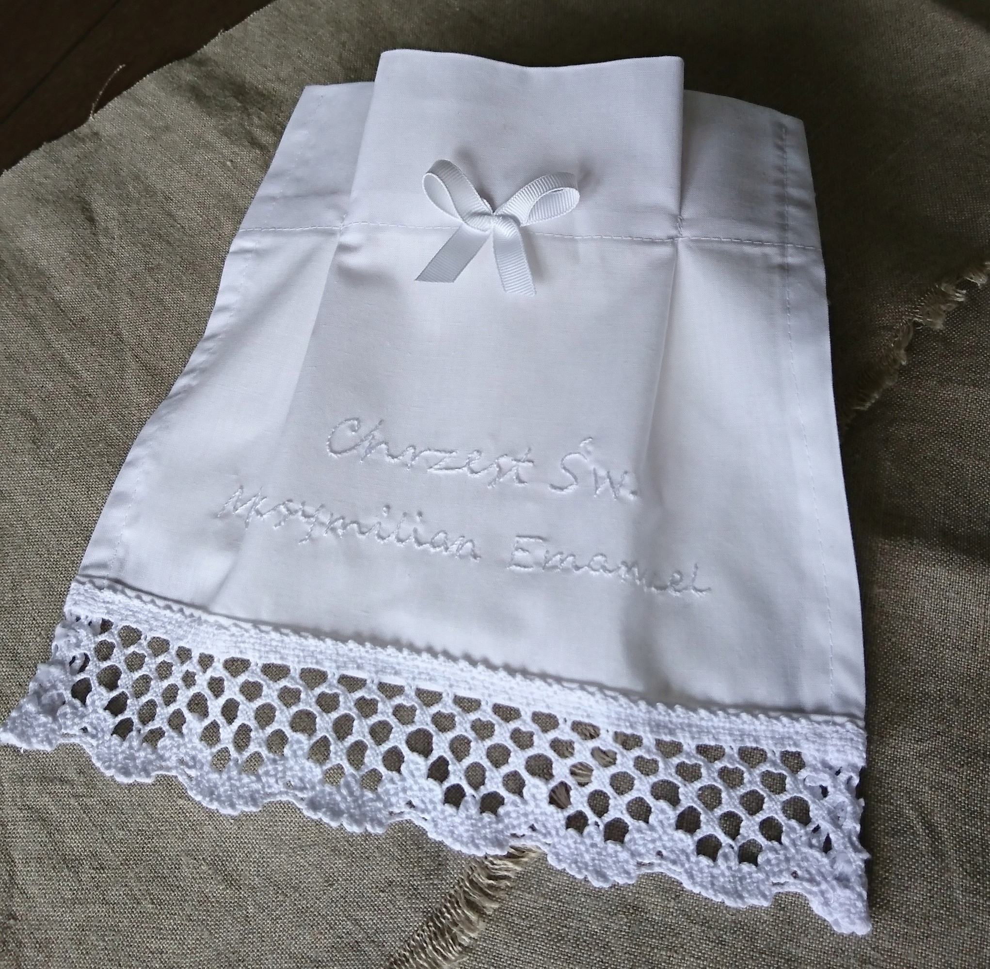- Халат (хрисма) - из белоснежного хлопка с широкой белое хлопчатобумажное кружево и нежная репсовая лента. Халат украшен персонализацией и ручной вышивкой. Размеры халата примерно 24 х 24 см.