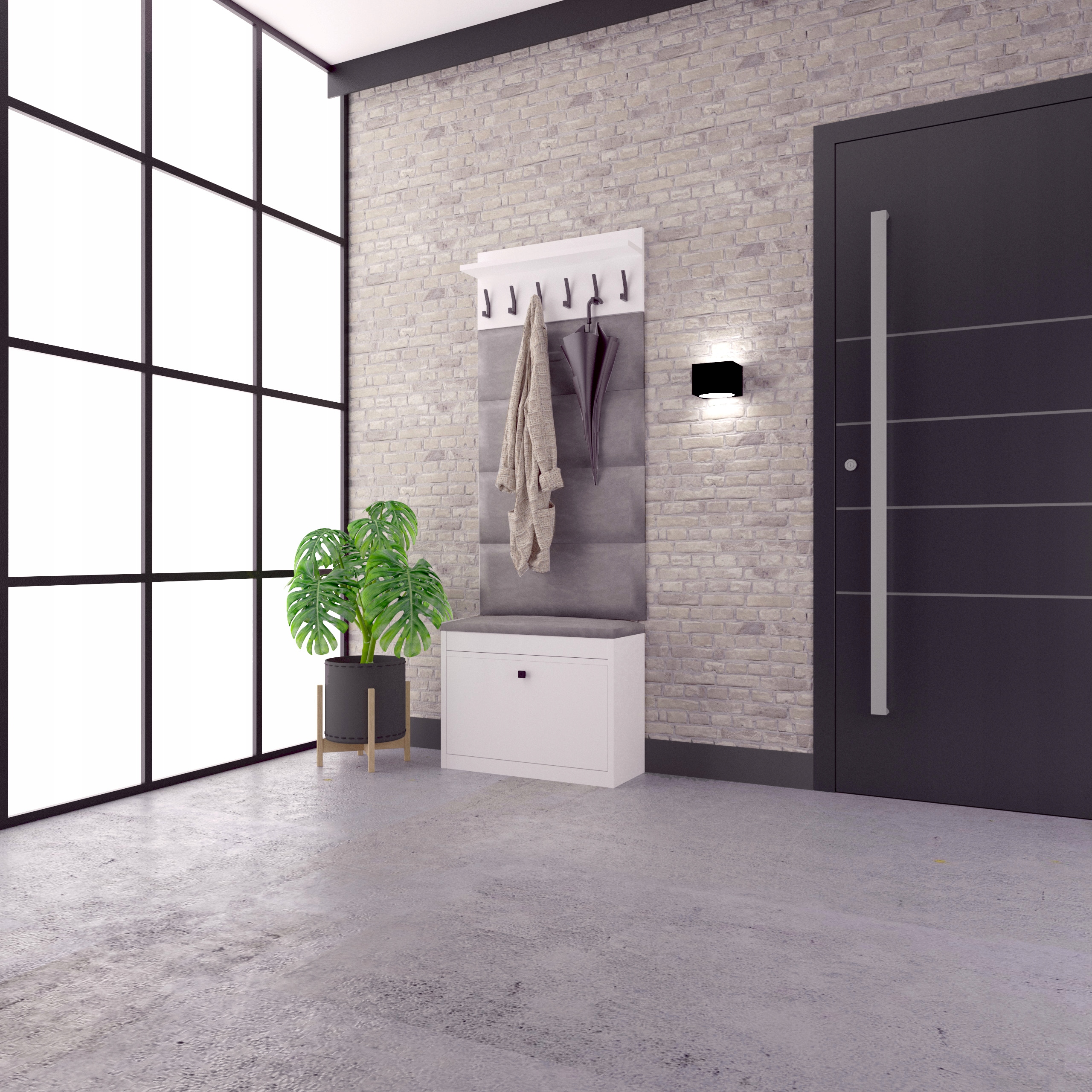 ШАФКА ДЛЯ ВЗУТТЯ ALASKA WHITE З СИДІННЯМ, ВІШАЛКОЮ, ОББИТИМИ ВЕЛЬВЕРОМ ПАНЕЛЯМИ