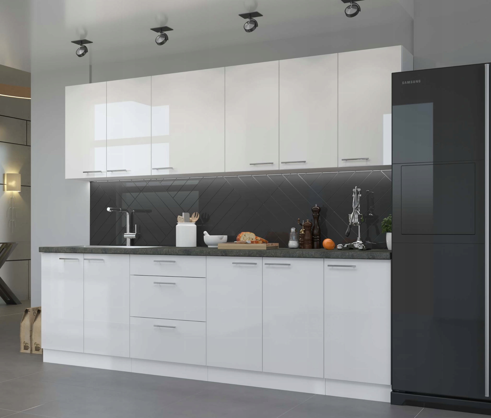 Практичный кухонный шкаф с белым глянцевым фасадом. Белый корпус шкафа с функцией плавного закрывания. Шкаф из коллекции кухонной мебели Лара.