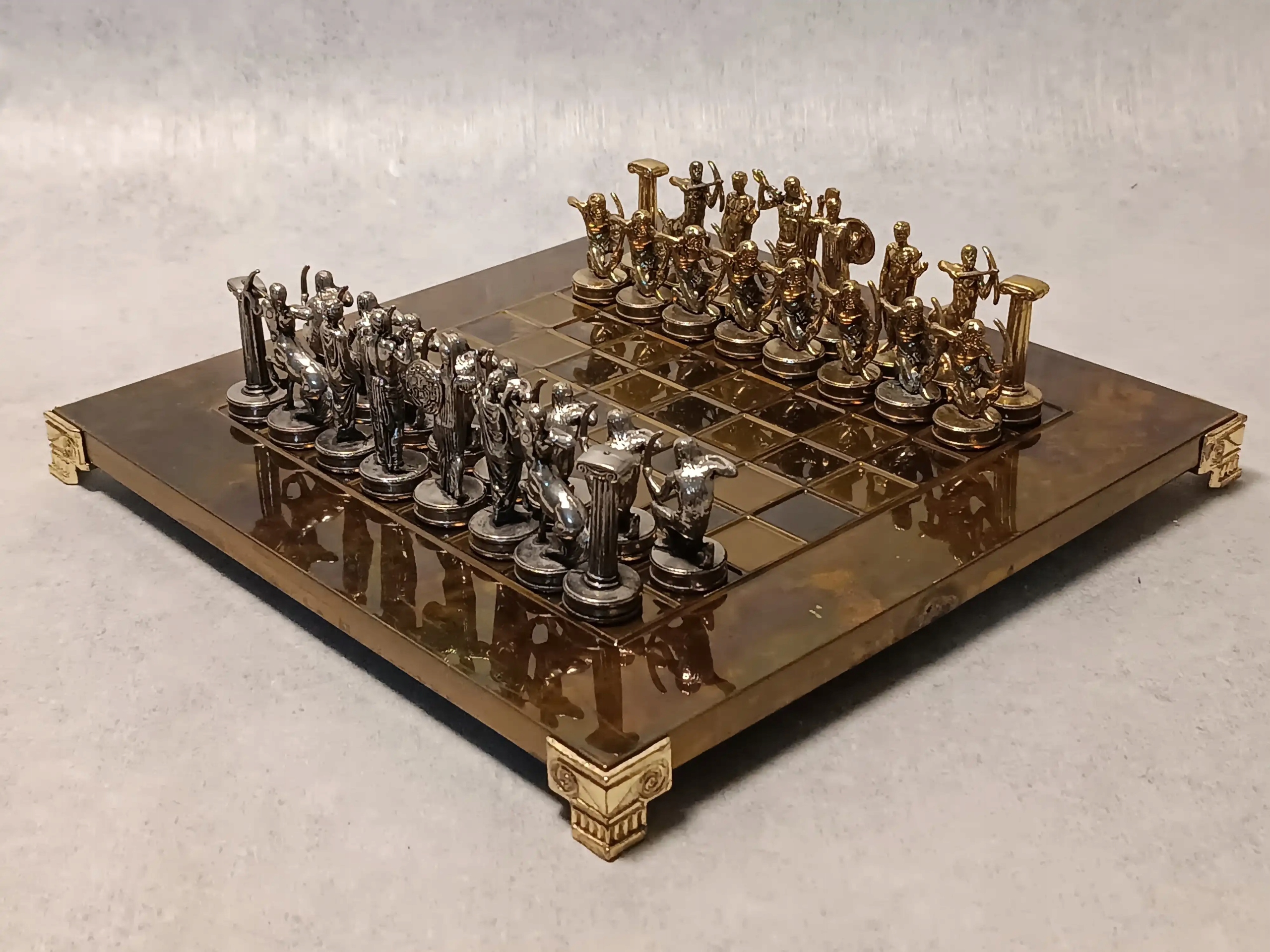 Шахматная доска размещена на массивном основании, также изготовленном из металла, с декоративными элементами в античном стиле.