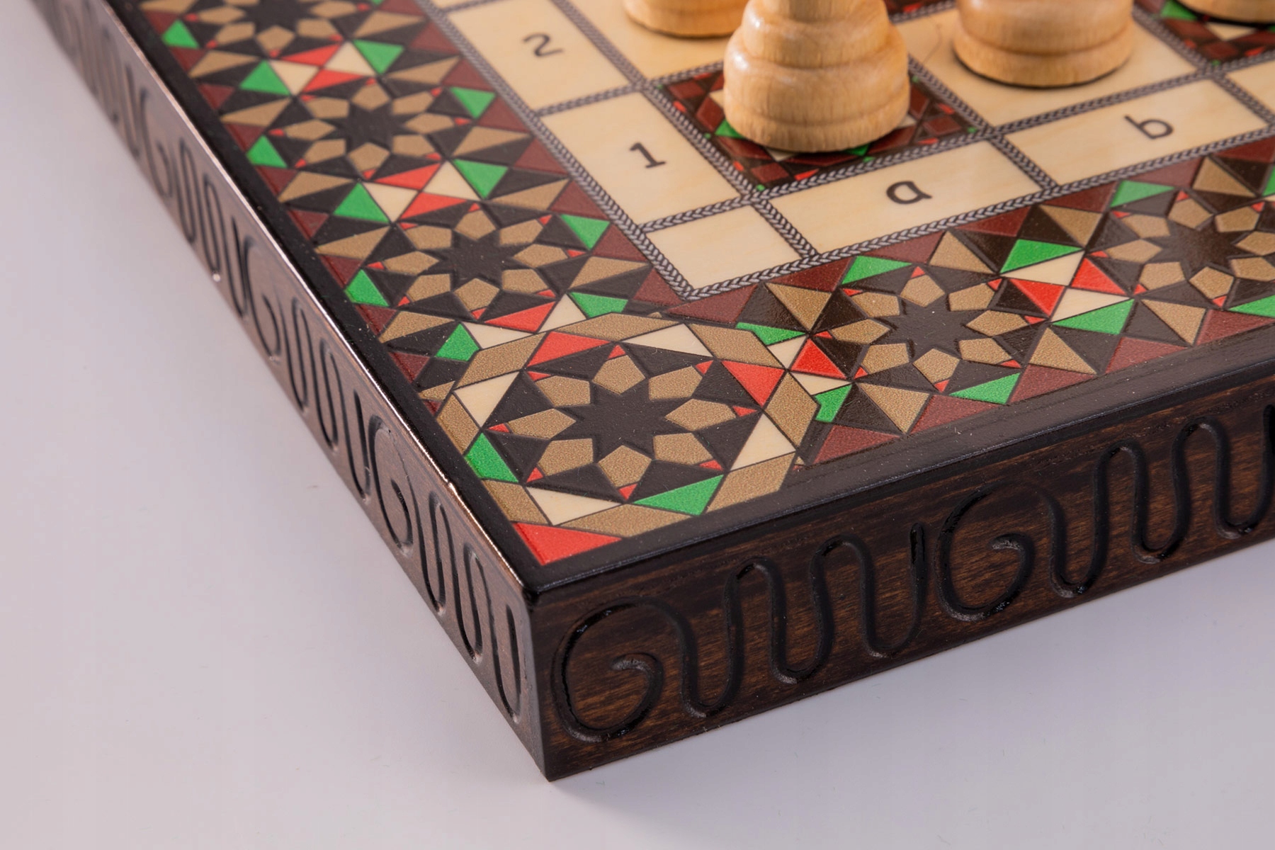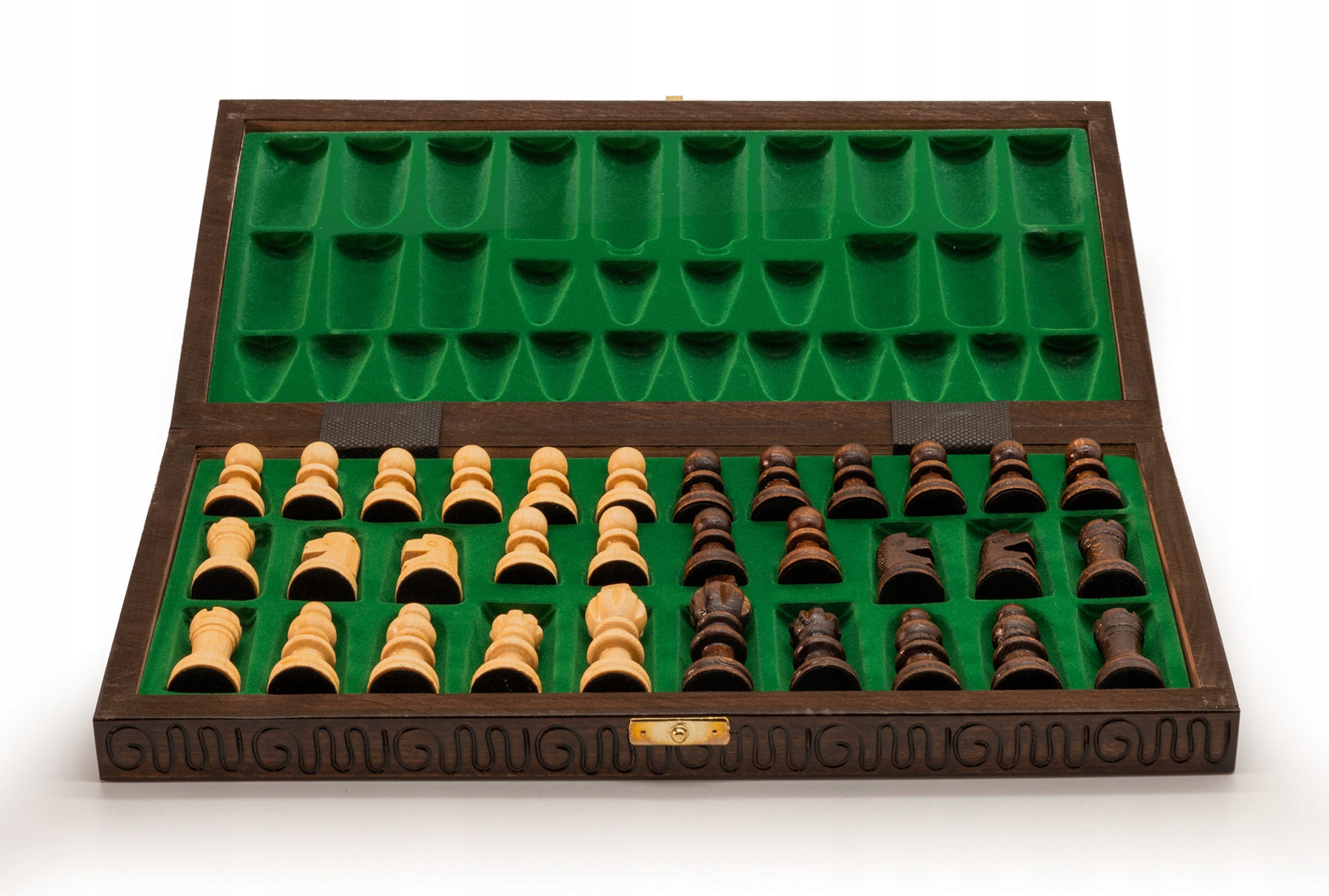 Внутри шахматной кассеты имеется вставка, покрытая флоком, благодаря чему каждая фигура и пешка защищены от механических повреждений.