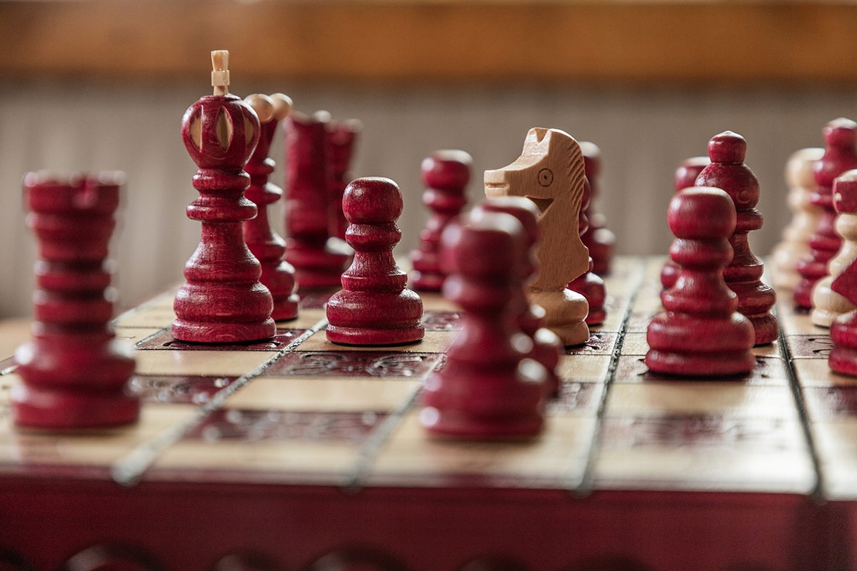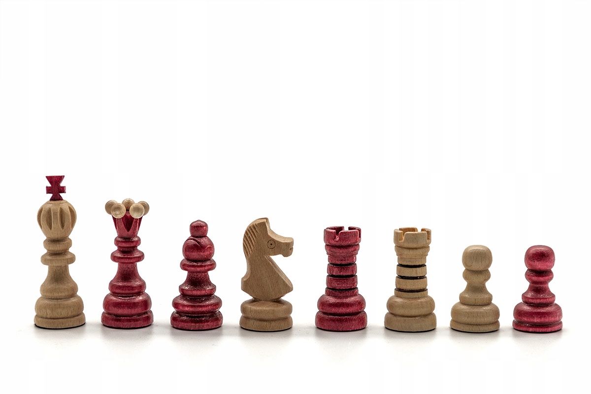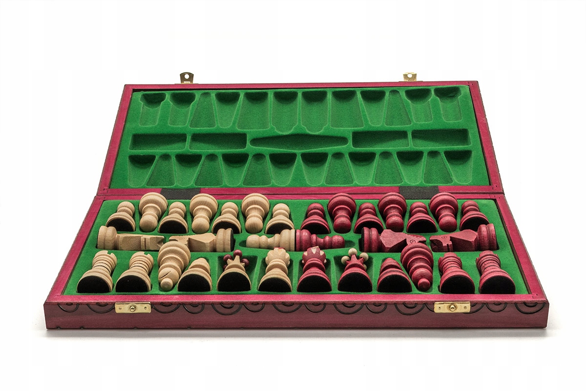 В комплект входит кассета с шахматной доской, набор шахматных фигур белого и вишневого цветов по 16 штук.