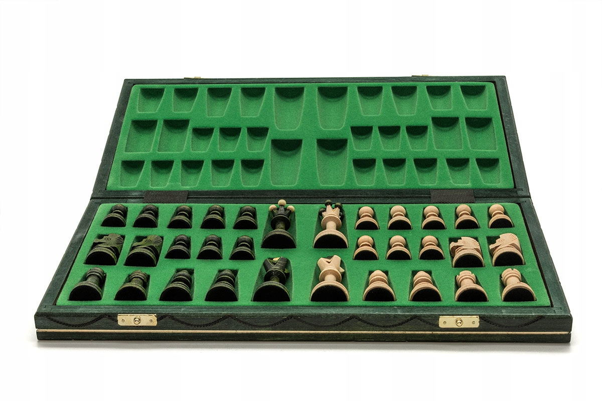 В комплект входит кассета с шахматной доской, набор шахматных фигур белого и зеленого цвета по 16 штук.