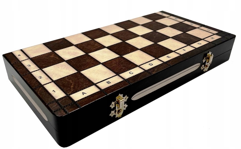Шахматная доска из древесины липы, морилка и лак, с застежкой золотистого цвета. Центр облицован зеленой вставкой.