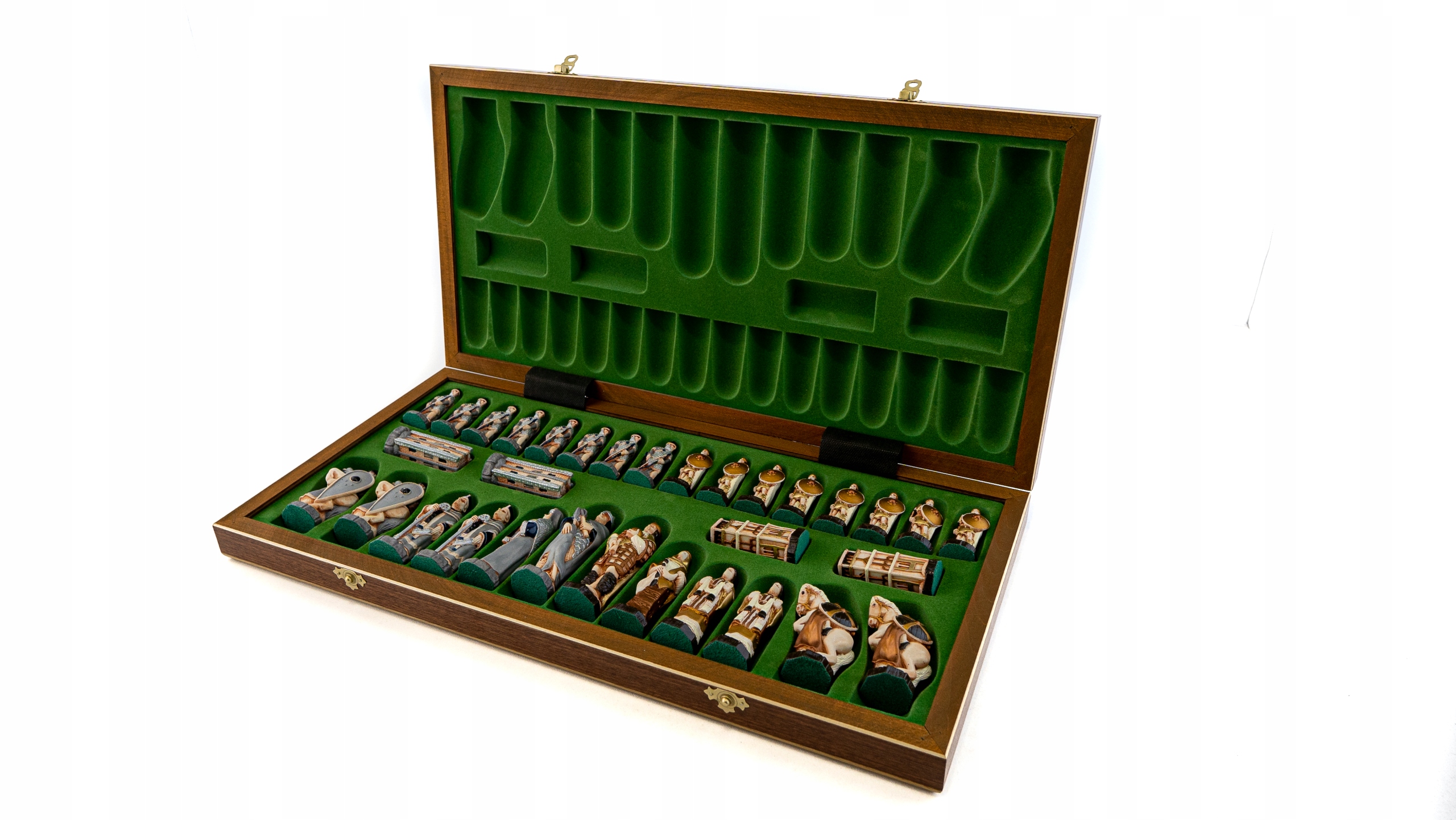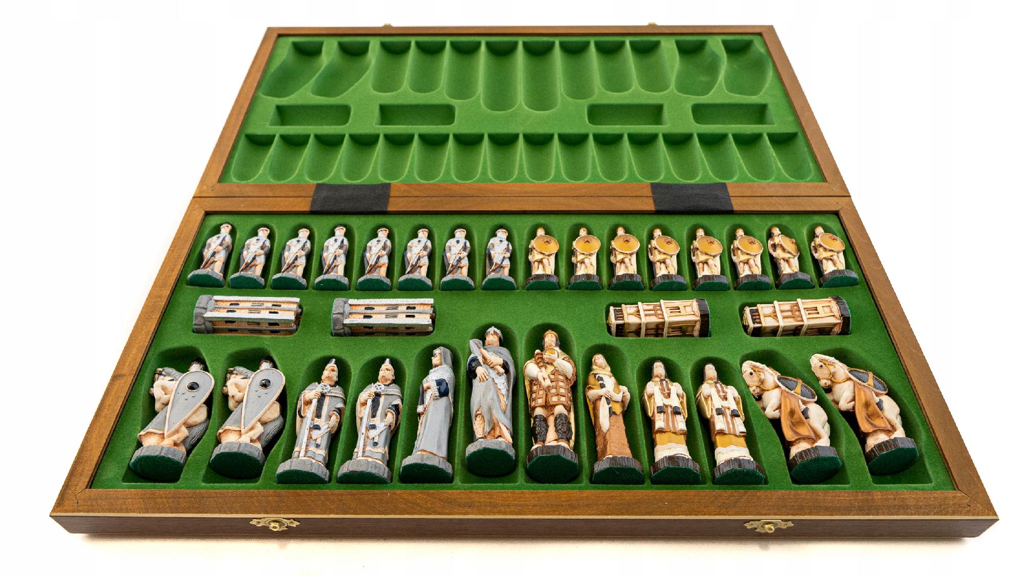 Шахматные фигуры из молотого мрамора, ручная роспись.. инкрустированная кассета, красное дерево и платан .